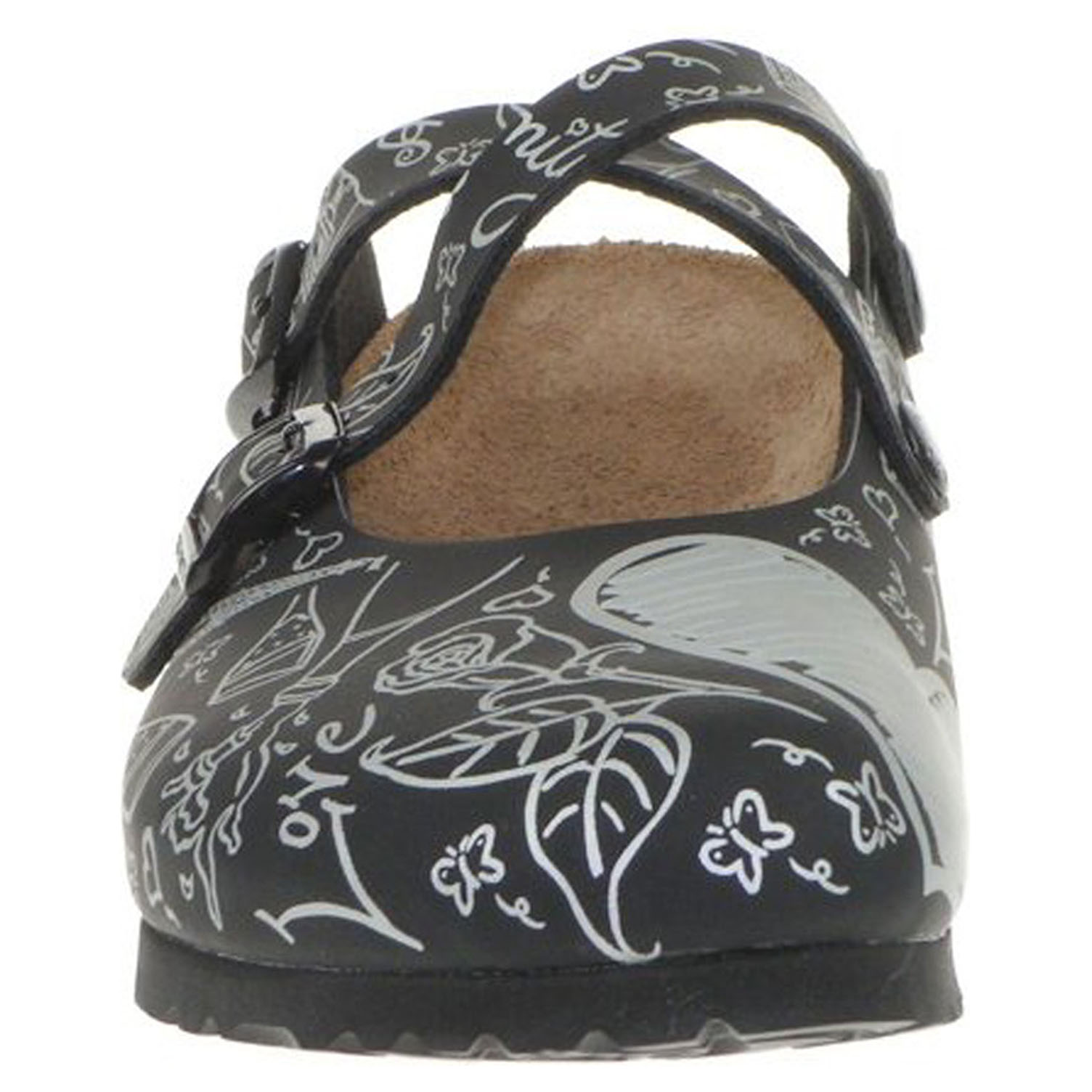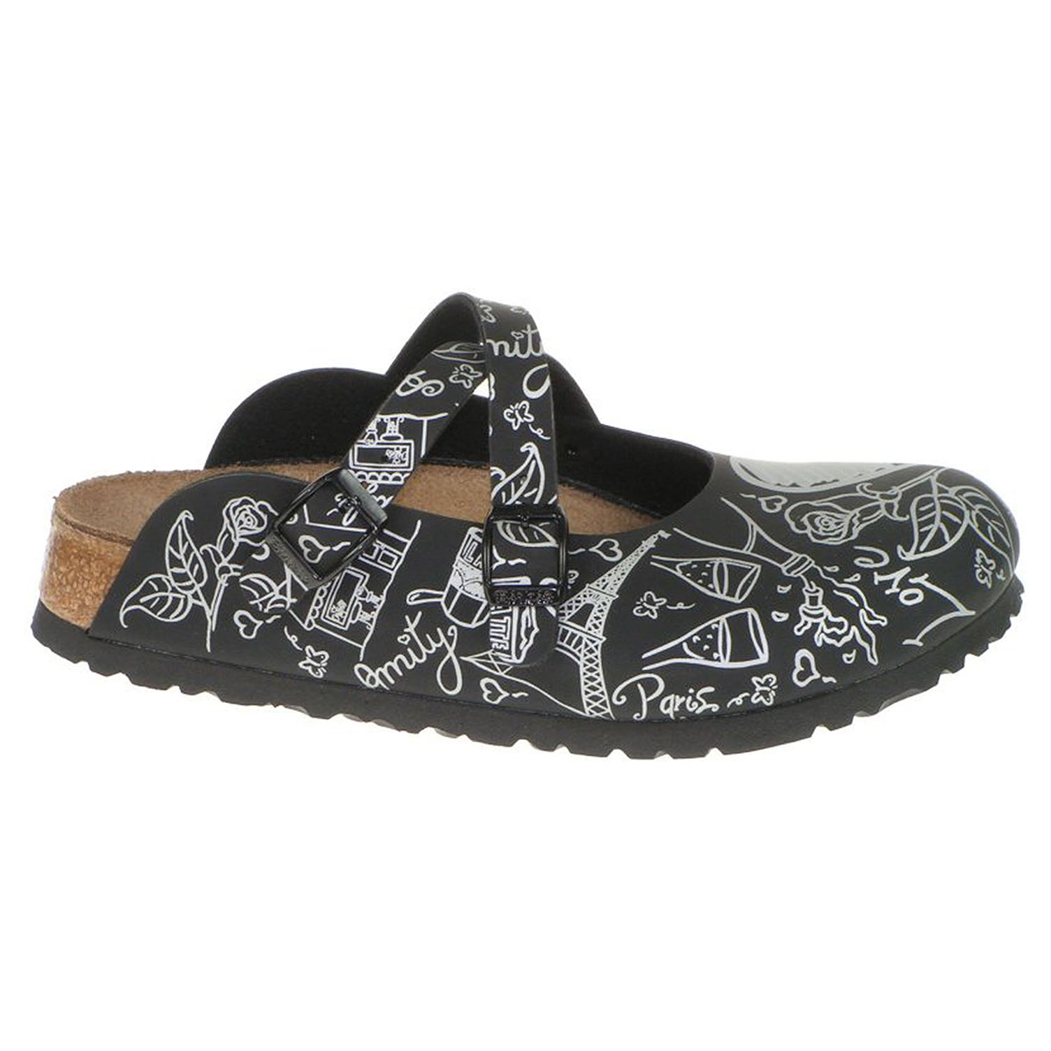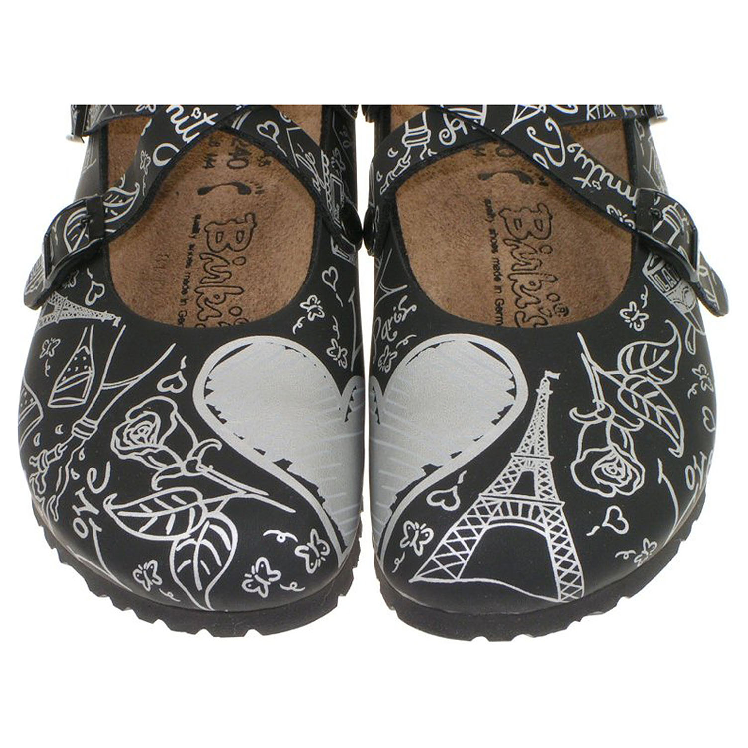 Boty Birkis - lepené dámské pantofle s koženou anatomicky tvarovanou stélku. Pásky přes nárt se zapínají na přezky. Lepená obuv - pevnost lepeného spoje může být negativně ovlivněna promáčením nebo propocením, event. opakovaným používáním nedostatečně vysušené obuvi. Při neopatrné chůzi může dojít k mechanickému uvolnění lepeného spoje - ukopnutí.