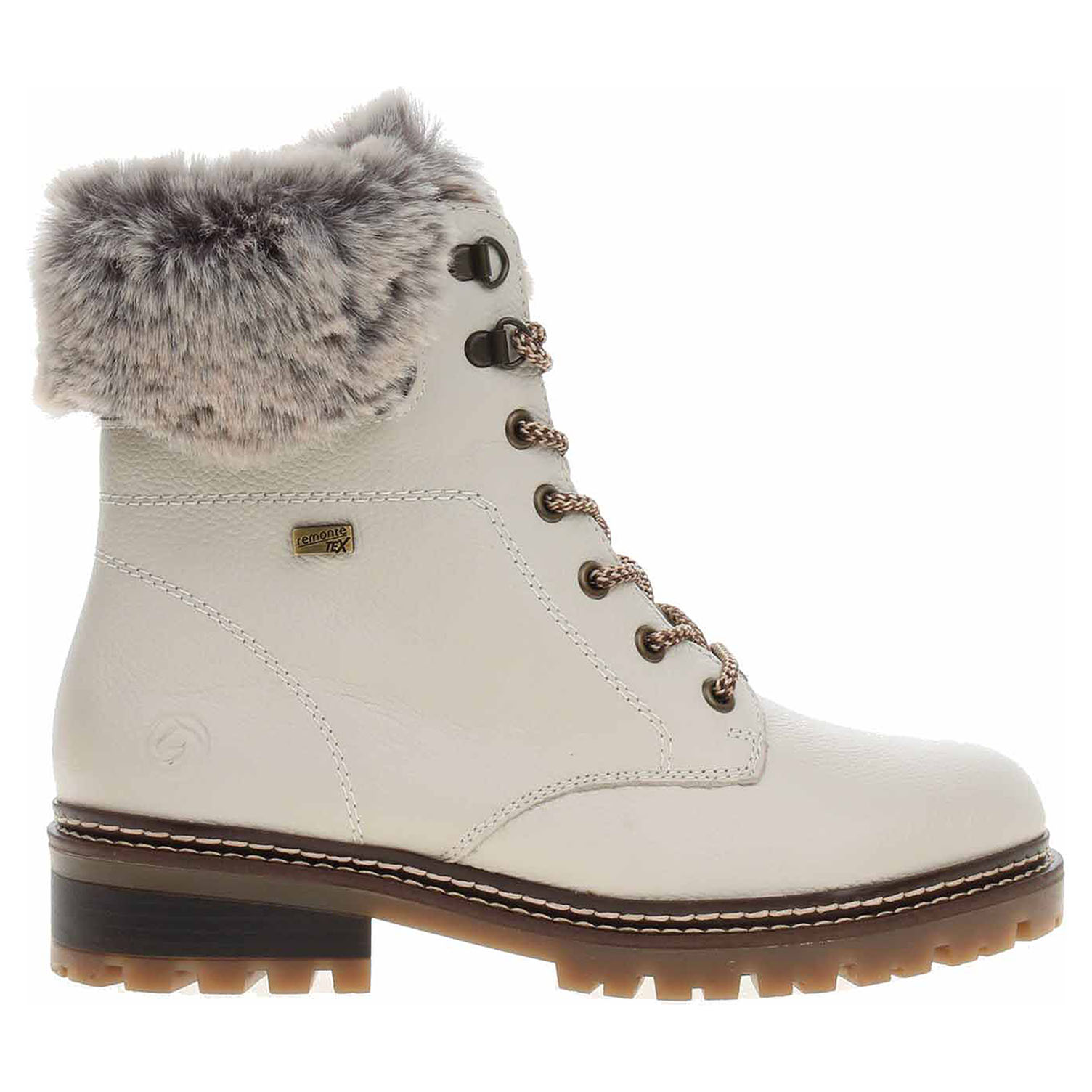 Boty Remonte - lepená dámská kotníková obuv se šněrováním má svršek z usně a textilní lem kolem kotníku, podšívku ze střižní ovčí vlny a je vybavená vodoodpudivou membránou RemonteTex a vyndavací stélkou Thermo Insole s nášlapnou vrstvou ze střižní ovčí vlny. Vyměnitelné vložky Thermo Insole (vhodné do nízkých teplot, ochraňují před chladem a zajišťují maximální komfort) je možné vyndat za účelem provětrání a omytí. Značnou výhodu nabízejí vyměnitelné vložky do bot také těm uživatelům, kteří používají ortopedické vkládací stélky. Glass Fibre Sole - Don‘t slip - have grip = skrytá funkce s velkým efektem. Speciální podrážka ze skleněných vláken, poskytuje extra přilnavost na zledovatělém povrchu. Už nikdy neuklouznete. Podpatek je vysoký 4,- cm a platforma je vysoká 1,5 cm. Lepená obuv - pevnost lepeného spoje může být negativně ovlivněna promáčením nebo propocením, event. opakovaným používáním nedostatečně vysušené obuvi. Při neopatrné chůzi může dojít k mechanickému uvolnění lepeného spoje - ukopnutí.