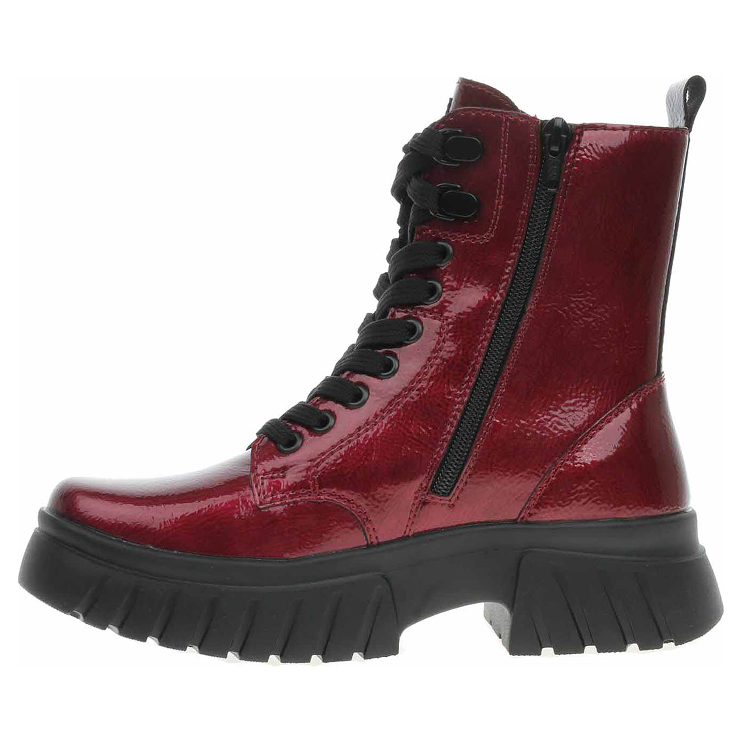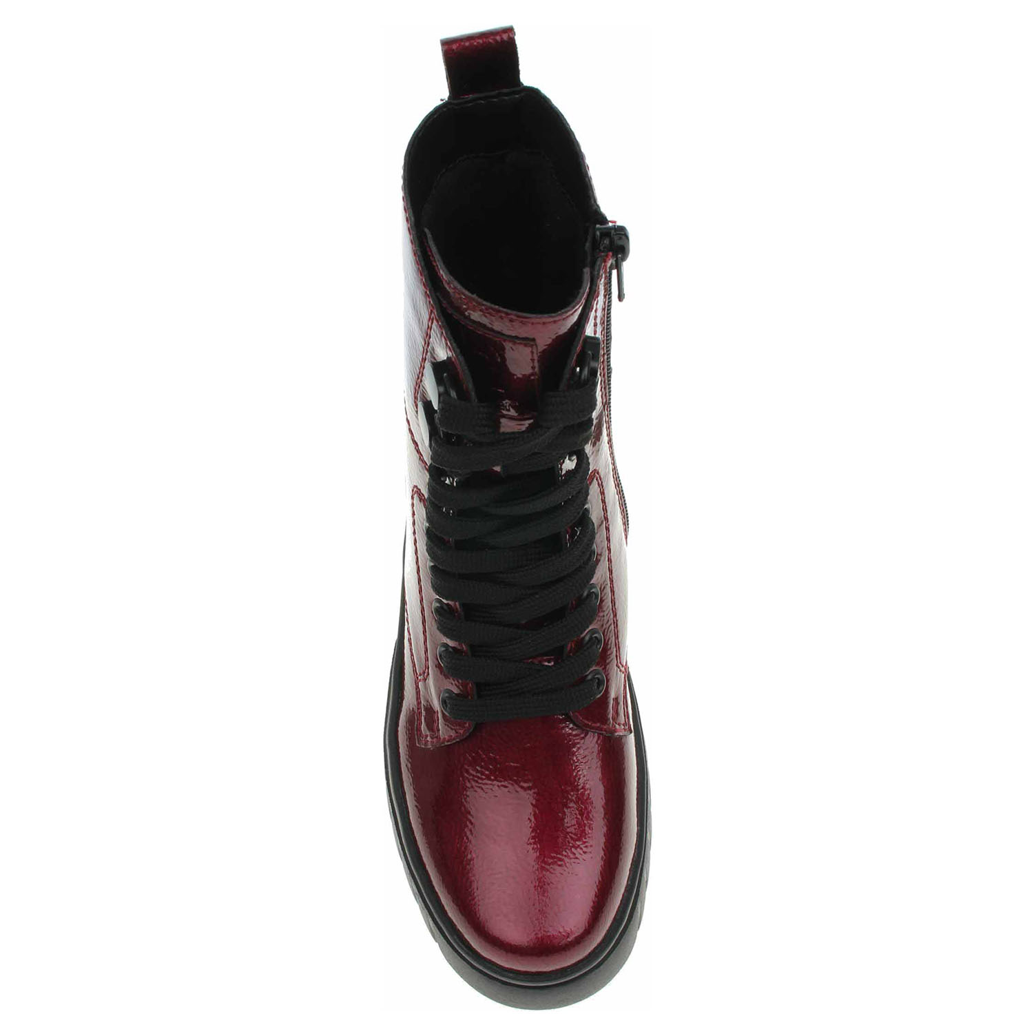 Boty Rieker - lakovaná dámská kotníková obuv se svrškem z usně a s textilní, vyndavací stélkou Rieker Soft je vyteplená textilní podšívkou s jemným chloupkem. Pro snadné nazouvání je obuv vybavená šněrováním a zipem na vnitřní straně. Rieker Soft – unikátní stélka vyrobená z prodyšného materiálu, která svým tvarem a materiálem zajistí pocit pohodlí při celodenním nošení. Rieker Light - maximální komfort při nošení vytváří kombinace lehké podešve, velmi příjemných materiálů a komfortní stélky. Podpatek je vysoký 4,9 cm a platforma je vysoká 3,- cm. Podešev je flexibilní a díky systému Antistress (lehkost, pružnost, prostornost a vynikající absorpce nárazů) Vám obuv zajistí pohodlí při každém kroku. Lakovaná obuv - hladký, lesklý povrch je docílen lakovou úpravou. Povrch je choulostivý na mechanické poškození, rozmáčení a mráz. Ošetřujte prostředky na lakové usně.