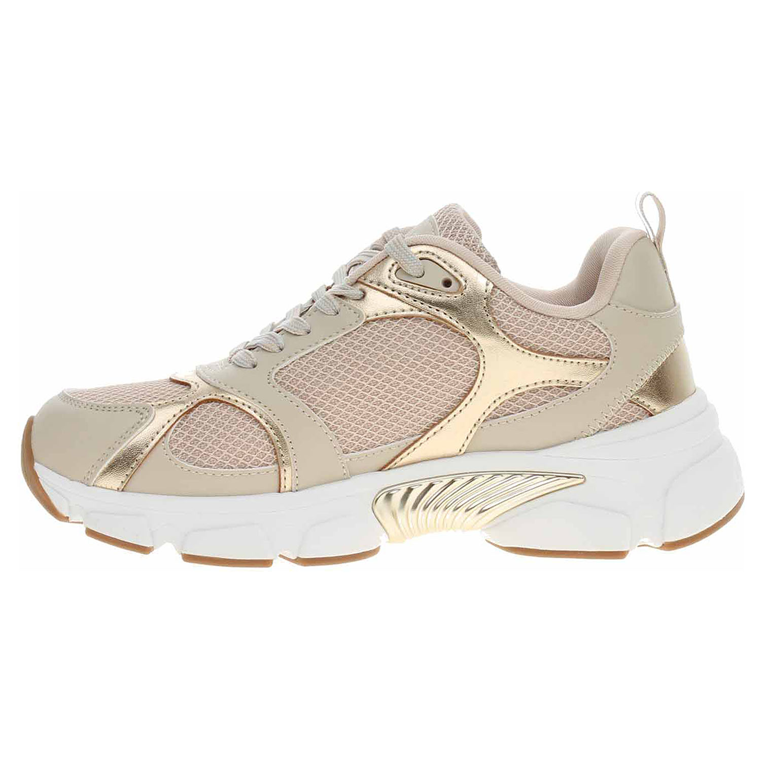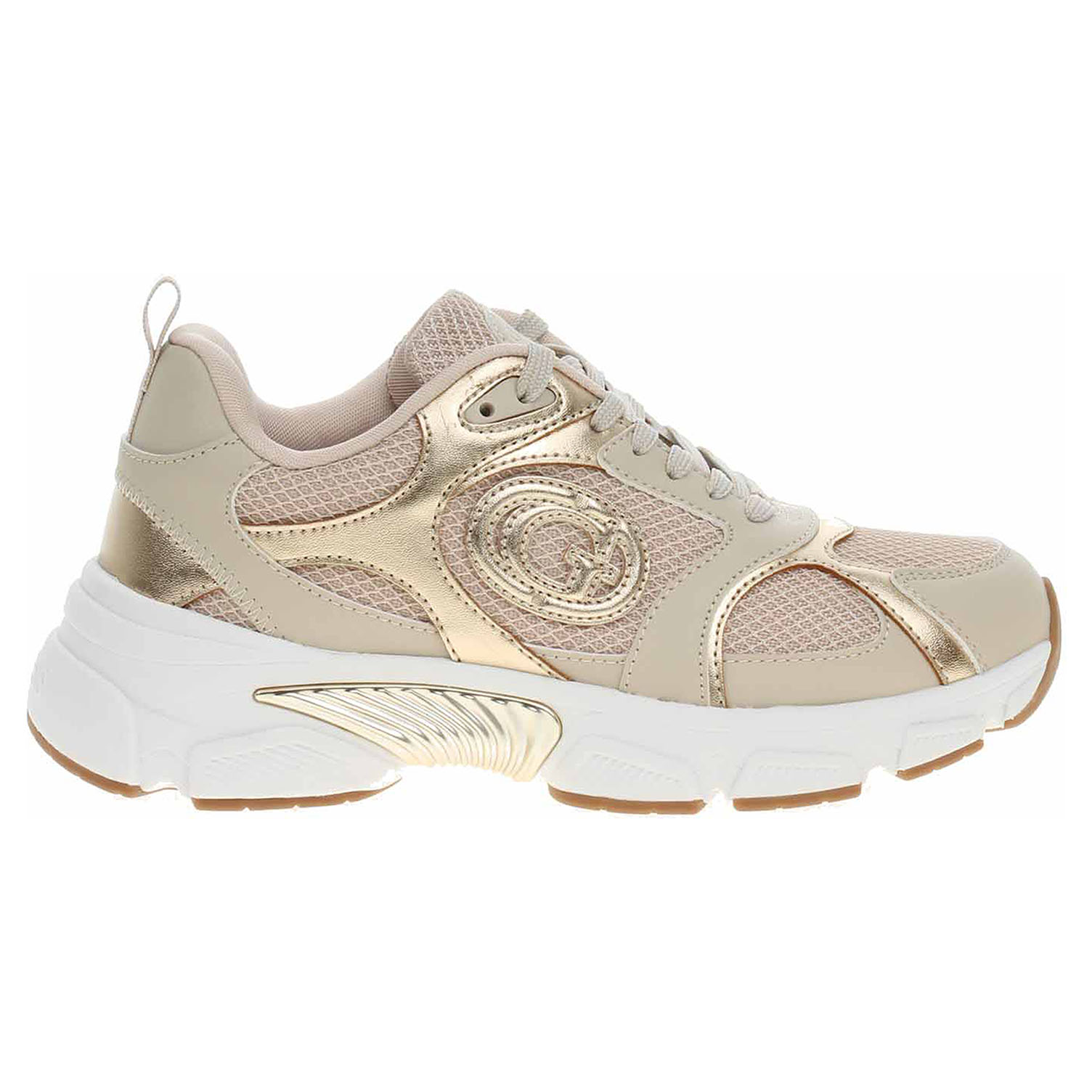 Boty Guess - módní dámská obuv se šněrováním má svršek v barevné kombinaci béžová/zlatá kombinovaný syntetika/textil (61 % polyuretan, 39 % polyester), textilní podšívku a je vybavená vyndavací stélkou s textilní nášlapnou vrstvou (100% polyester). Vyměnitelné vložky do bot je možné vyndat za účelem provětrání a omytí. Klínek je vysoký 4,5 cm a platforma je vysoká 2,5 cm. Módní obuv - je určena pro krátkodobé nošení v nenáročných podmínkách. Prvořadá je módnost nikoliv životnost. Obuv není vhodná pro každodenní používání.