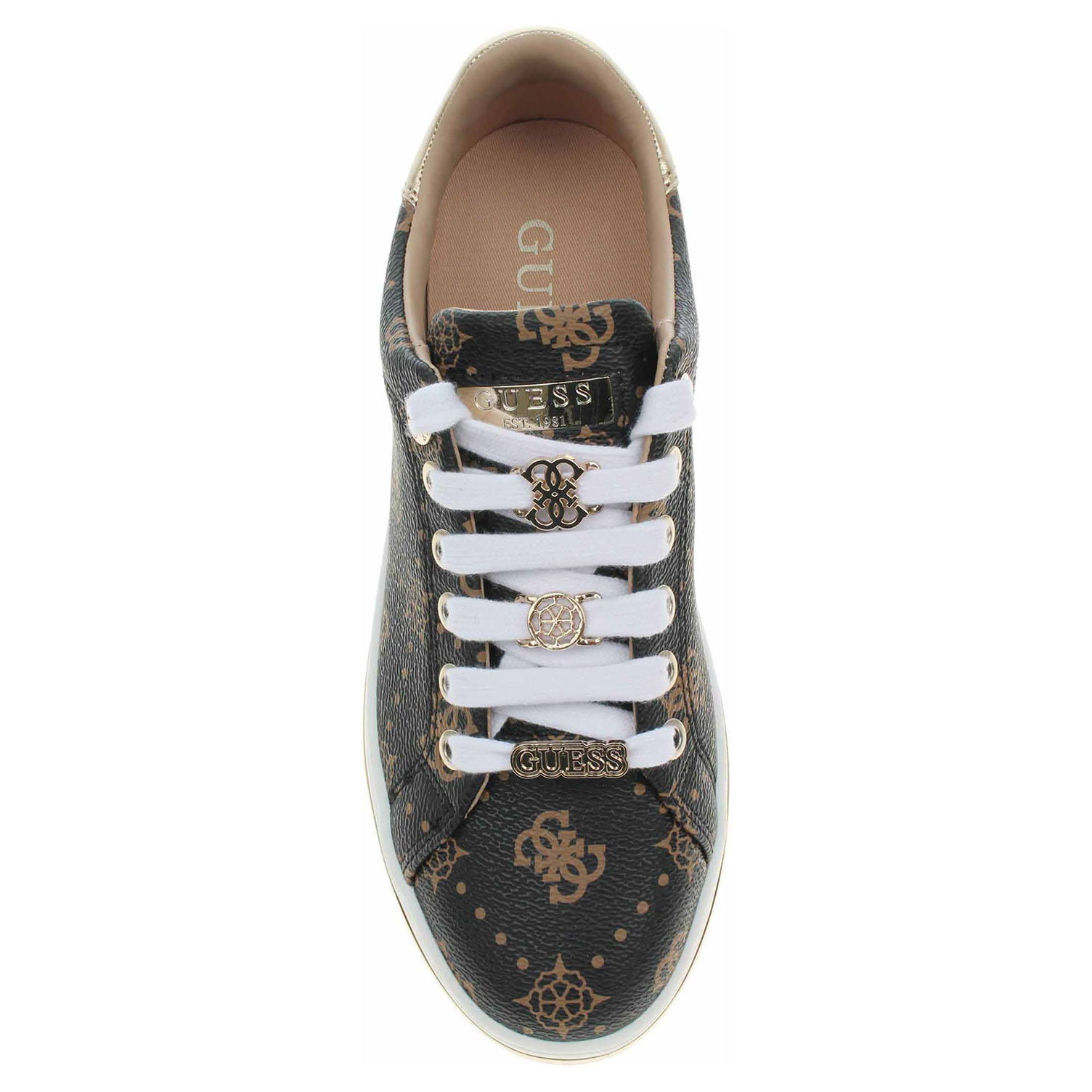 Boty Guess - módní dámská obuv se šněrováním má svršek ze syntetiky (100% polyuretan) zdobený reliéfním logem 4G a pivoňkami, bavlněnou podšívku i stélku. Tkaničky jsou ozdobené 3x logem 4G, pivoňky a Guess. Klínek je vysoký 3,1 cm a platforma je vysoká 2,- cm. Módní obuv - je určena pro krátkodobé nošení v nenáročných podmínkách. Prvořadá je módnost nikoliv životnost. Obuv není vhodná pro každodenní používání.