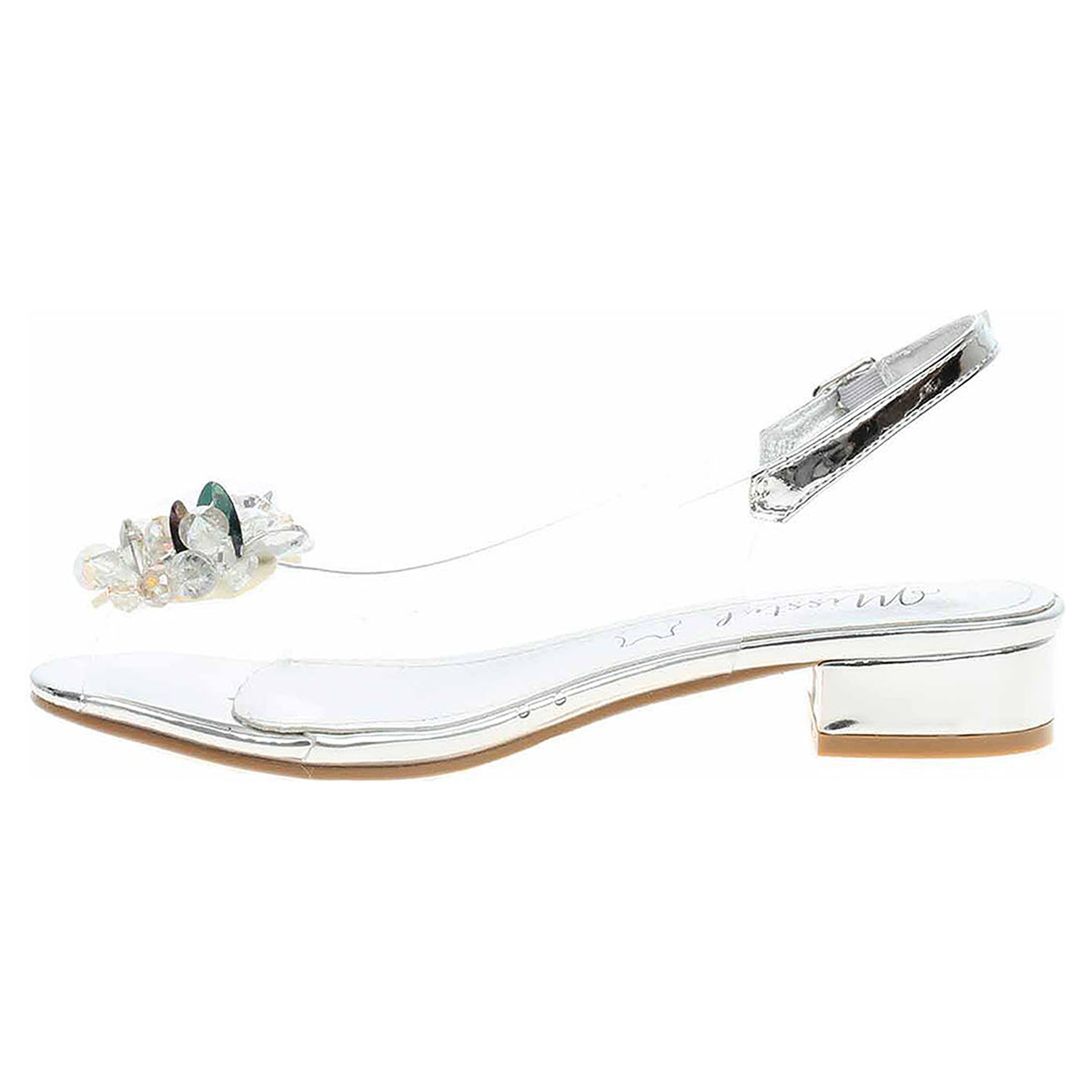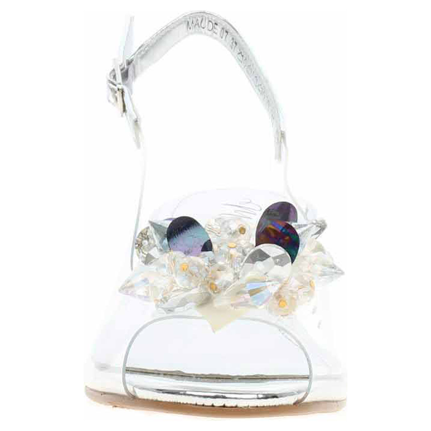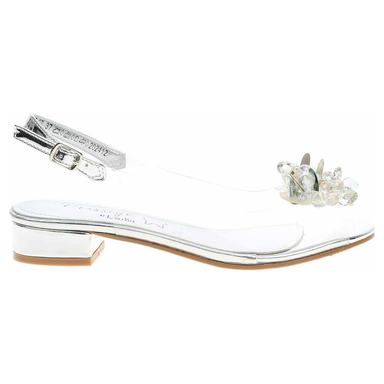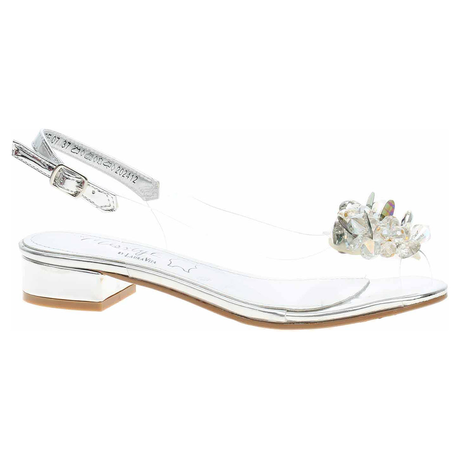 Laura Vita Maude 07 - společenská dámská obuv s transparentním svrškem ze syntetiky (80% PVC + 20% polyuretan) a se stélkou s nášlapnou vrstvou z usně má podpatek vysoký 3,- cm. Pásek přes patu se zapíná na přezku. Společenská obuv - vhodná ke krátkodobému nošení v interiérech. Obuv nevystavujte vlhkosti.