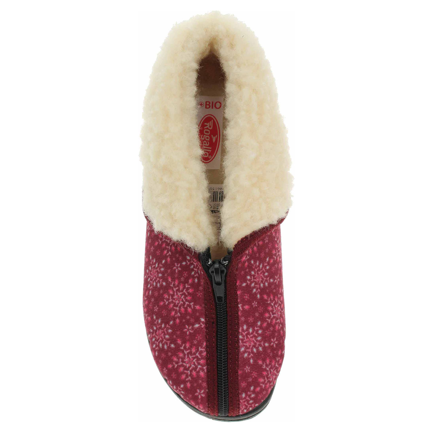 Boty Rogallo - dámské kotníkové bačkory s textilním svrškem jsou vyteplené textilní podšívkou s jemným chloupkem. Pohodlné nazouvání zajišťuje zip na špičce. Klínek je vysoký 3,- cm.