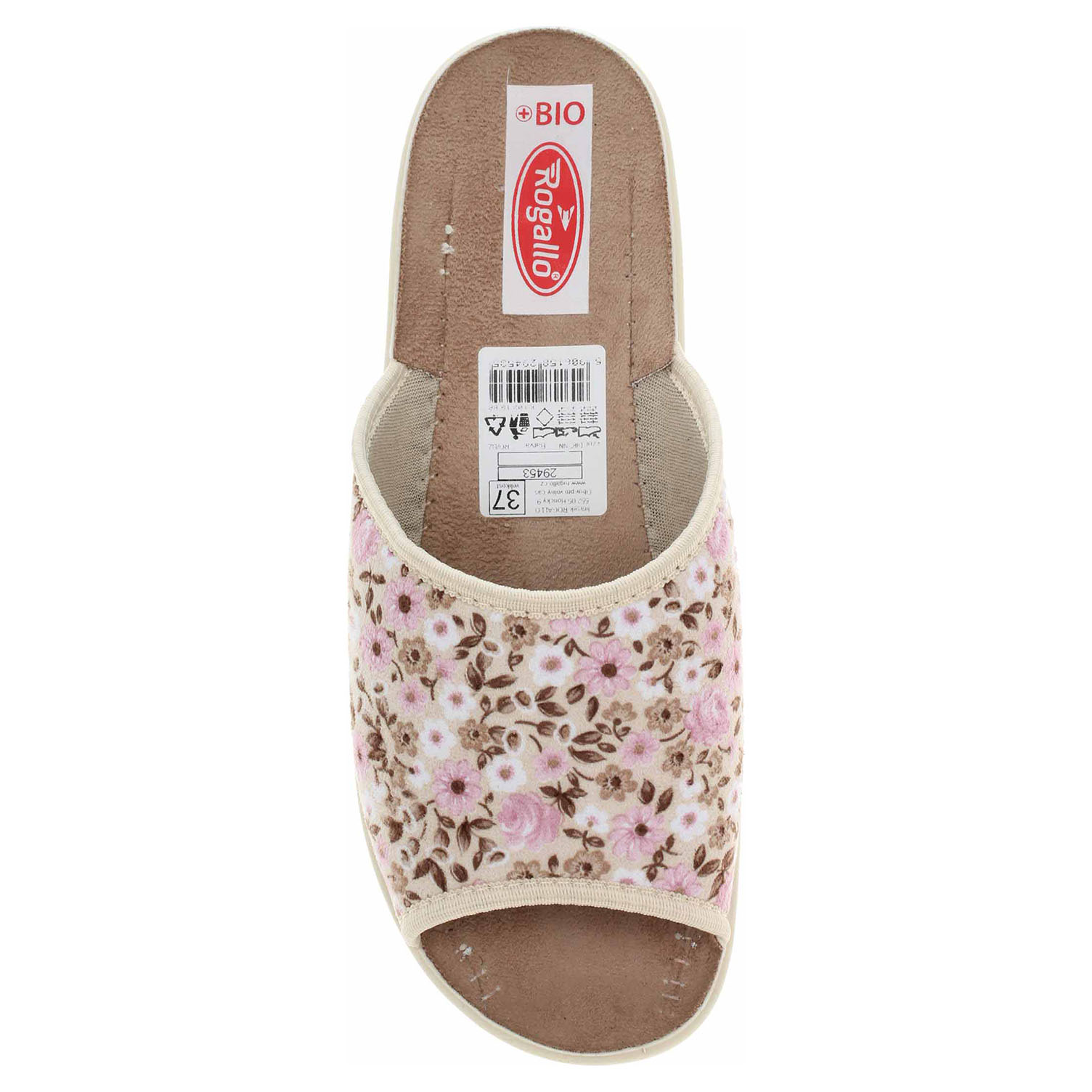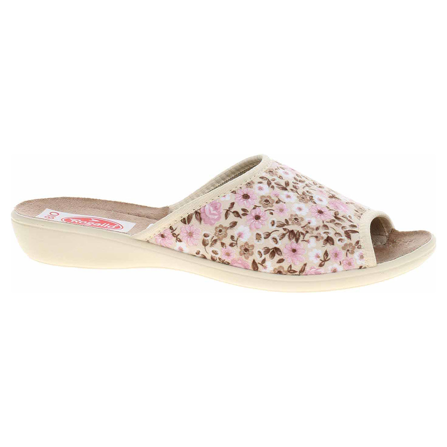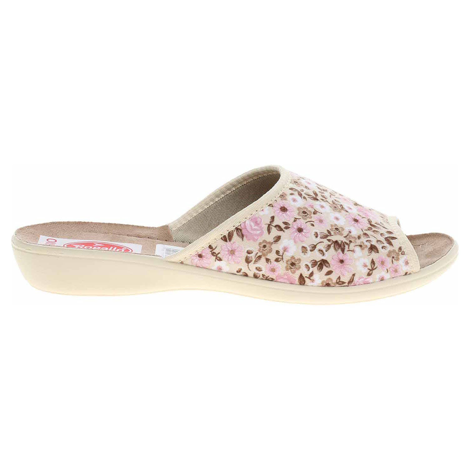 Boty Rogallo - dámské domácí pantofle s otevřenou špičkou na klínku vysokém 2,- cm. Svršek, podšívka i stélka jsou textilní.