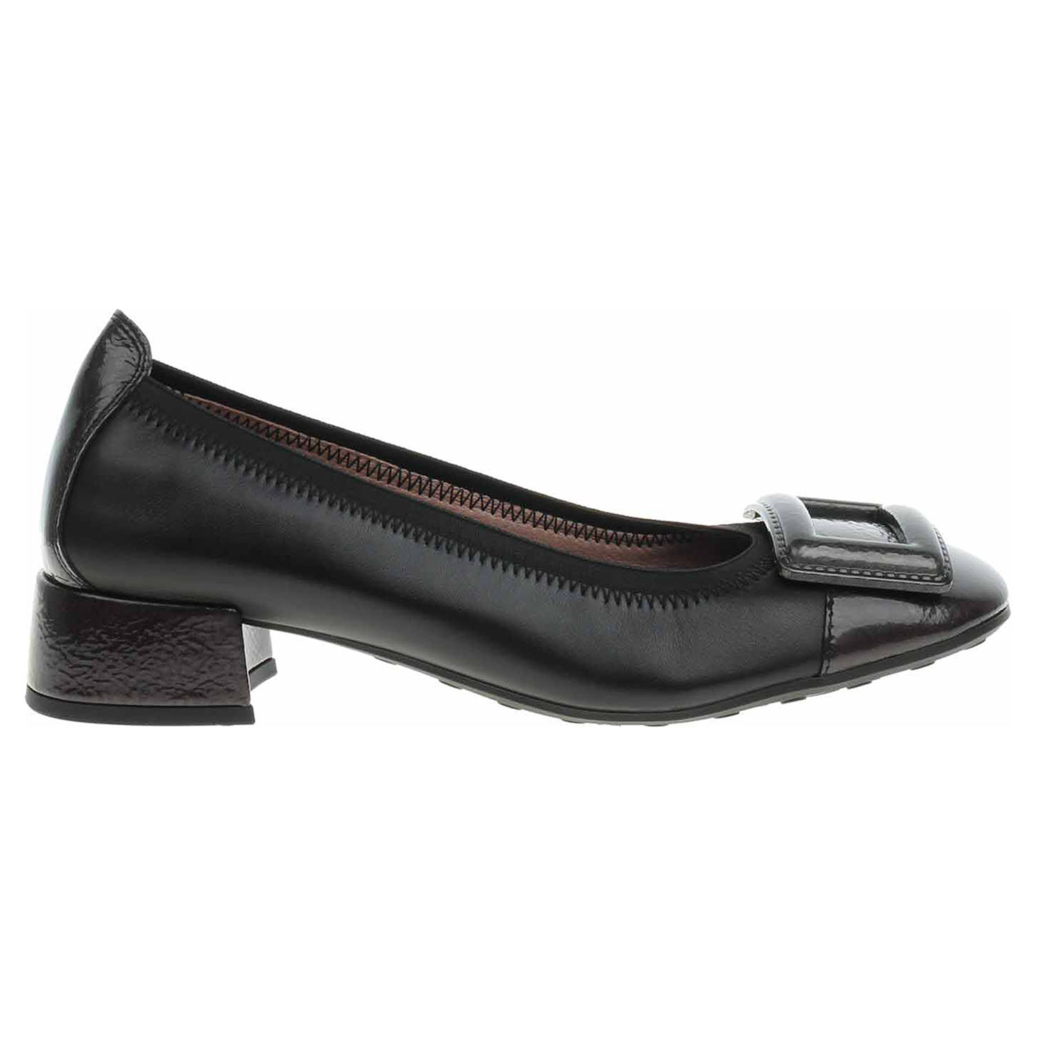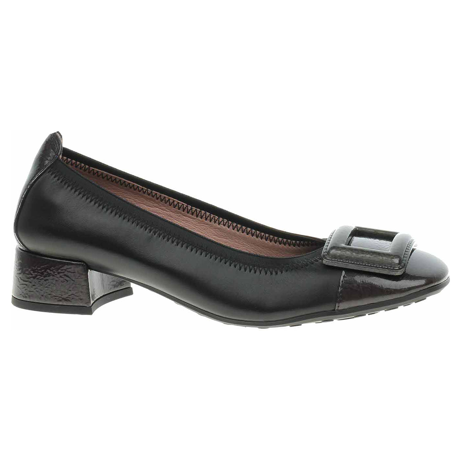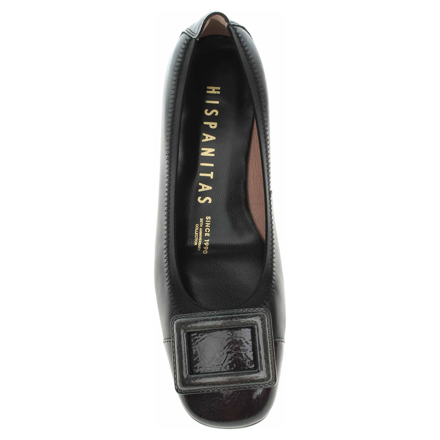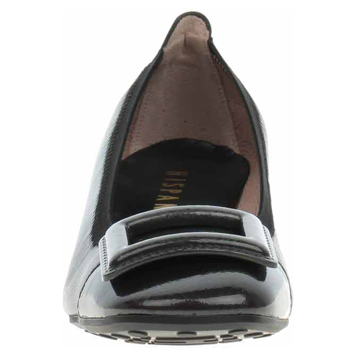 Boty Hispanitas - lakované dámské lodičky s ozdobnou, lakovanou sponou na špičce mají svršek, podšívku i stélku z usně. Obšitý nástup do obuvi dobře drží tvar a přiléhá k noze. Technologie Triflow: trojité polstrování v oblasti běhounu, které absorbuje nárazy a poskytuje tlumený efekt při chůzi. Podešev z termoplastického polyuretanu má podpatek potažený lakovanou usní, který je vysoký 2,5 cm. Lakovaná obuv - hladký, lesklý povrch je docílen lakovou úpravou. Povrch je choulostivý na mechanické poškození, rozmáčení a mráz. Ošetřujte prostředky na lakové usně.