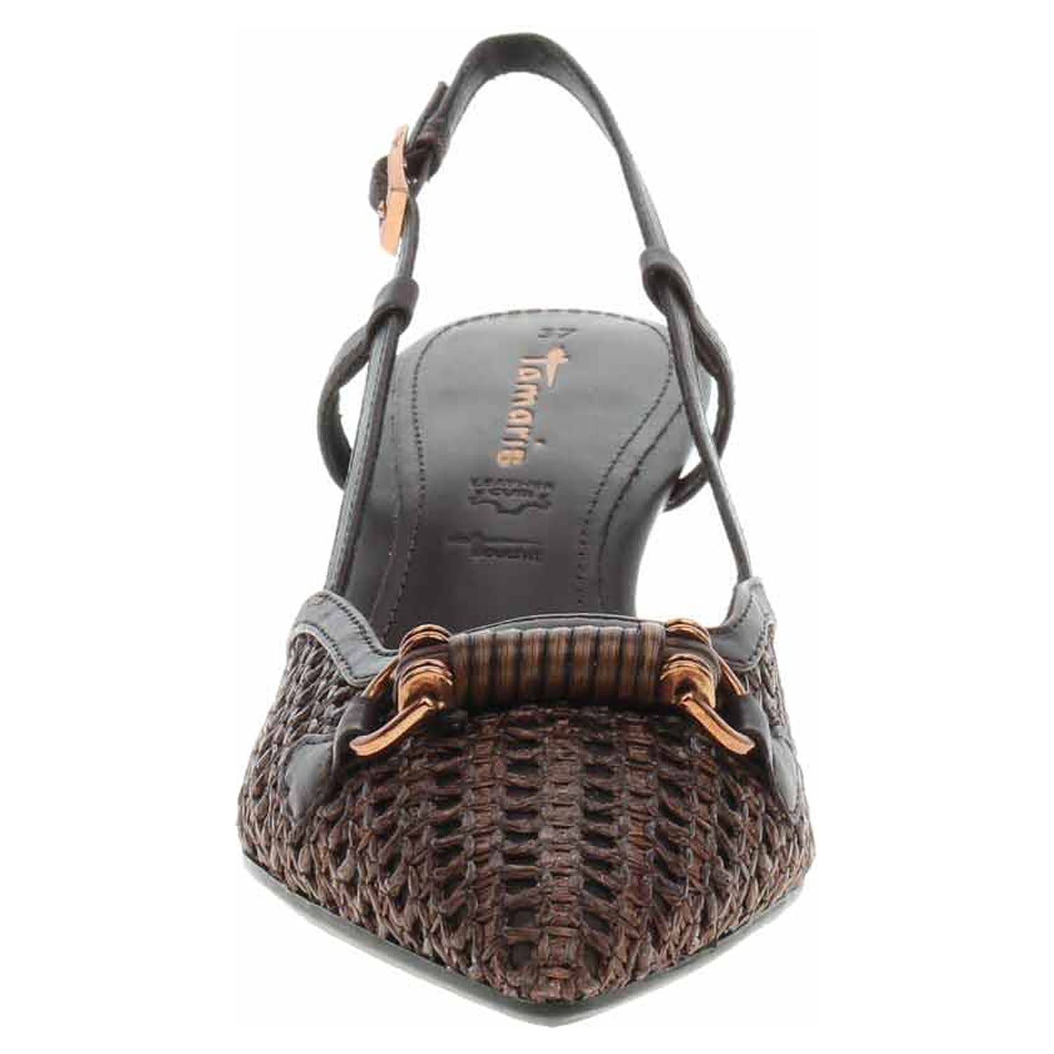 Boty Tamaris - lepené dámské lodičky s volnou patou mají proplétaný svršek kombinovaný useň/textil, podšívku kombinovanou textil/syntetika a stélku kombinovanou useň/syntetika. Paměťová stélka Touch it se přizpůsobuje vašemu chodidlu a zajišťuje při chůzi optimální komfort. Pásek přes patu se všitou gumičkou se zapíná na přezku a poskytuje tak možnost délkové regulace. Podpatek je vysoký 5,5 cm. Lepená obuv - pevnost lepeného spoje může být negativně ovlivněna promáčením nebo propocením, event. opakovaným používáním nedostatečně vysušené obuvi. Při neopatrné chůzi může dojít k mechanickému uvolnění lepeného spoje - ukopnutí.