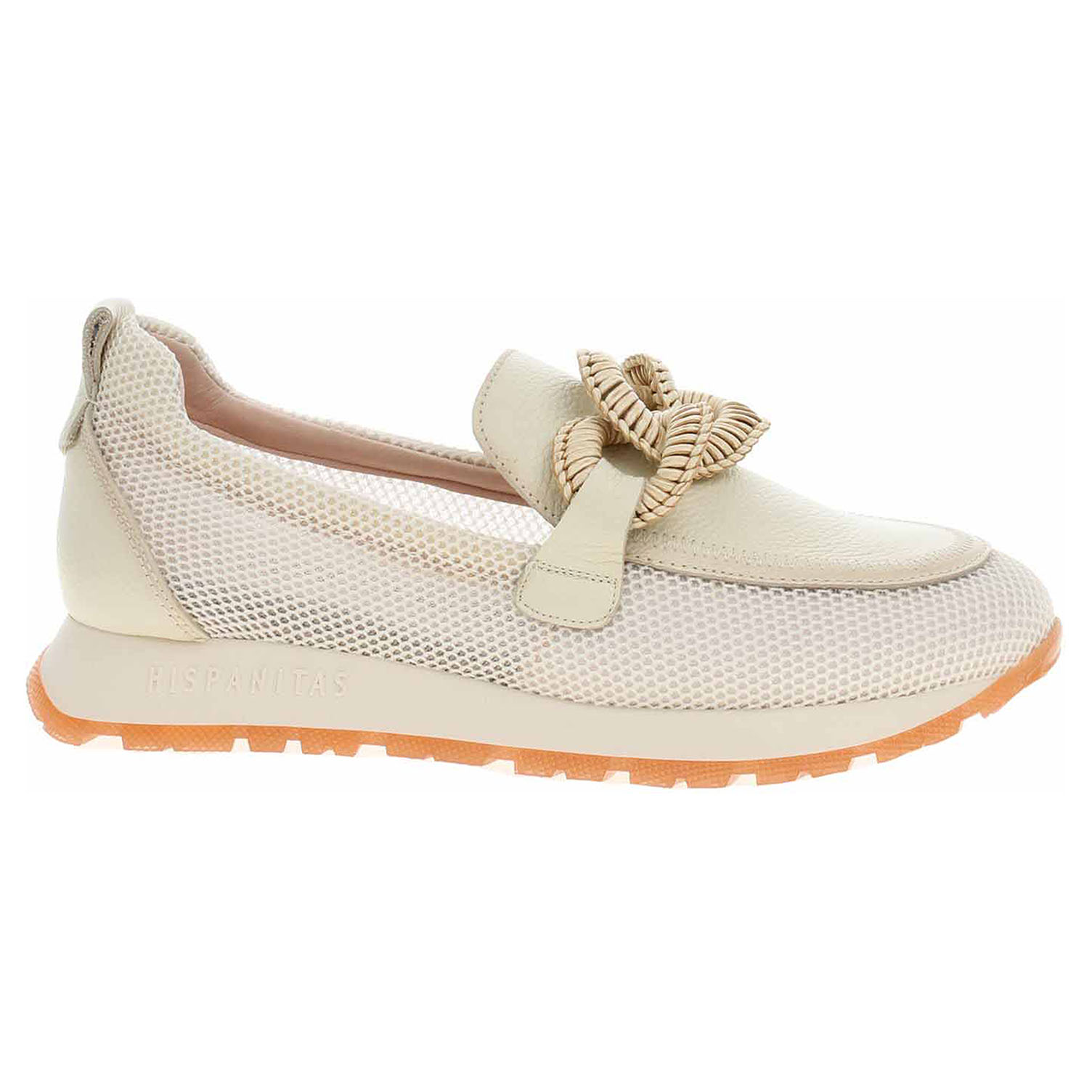 Boty Hispanitas - módní dámské mokasiny s ručně vyrobeným detailem řetízku na nártu mají svršek kombinovaný hovězí kůž/recyklovaný polyester, podšívku z mikrovlákna a jsou vybavené vyndavací stélkou. Technologie Triflow: trojité polstrování v oblasti běhounu, které absorbuje nárazy a poskytuje tlumený efekt při chůzi. Podešev z termoplastického polyuretanu poskytuje vynikající odpružení a protiskluzovou přilnavost. Klínek je vysoký 3,- cm. Módní obuv - je určena pro krátkodobé nošení v nenáročných podmínkách. Prvořadá je módnost nikoliv životnost. Obuv není vhodná pro každodenní používání.
