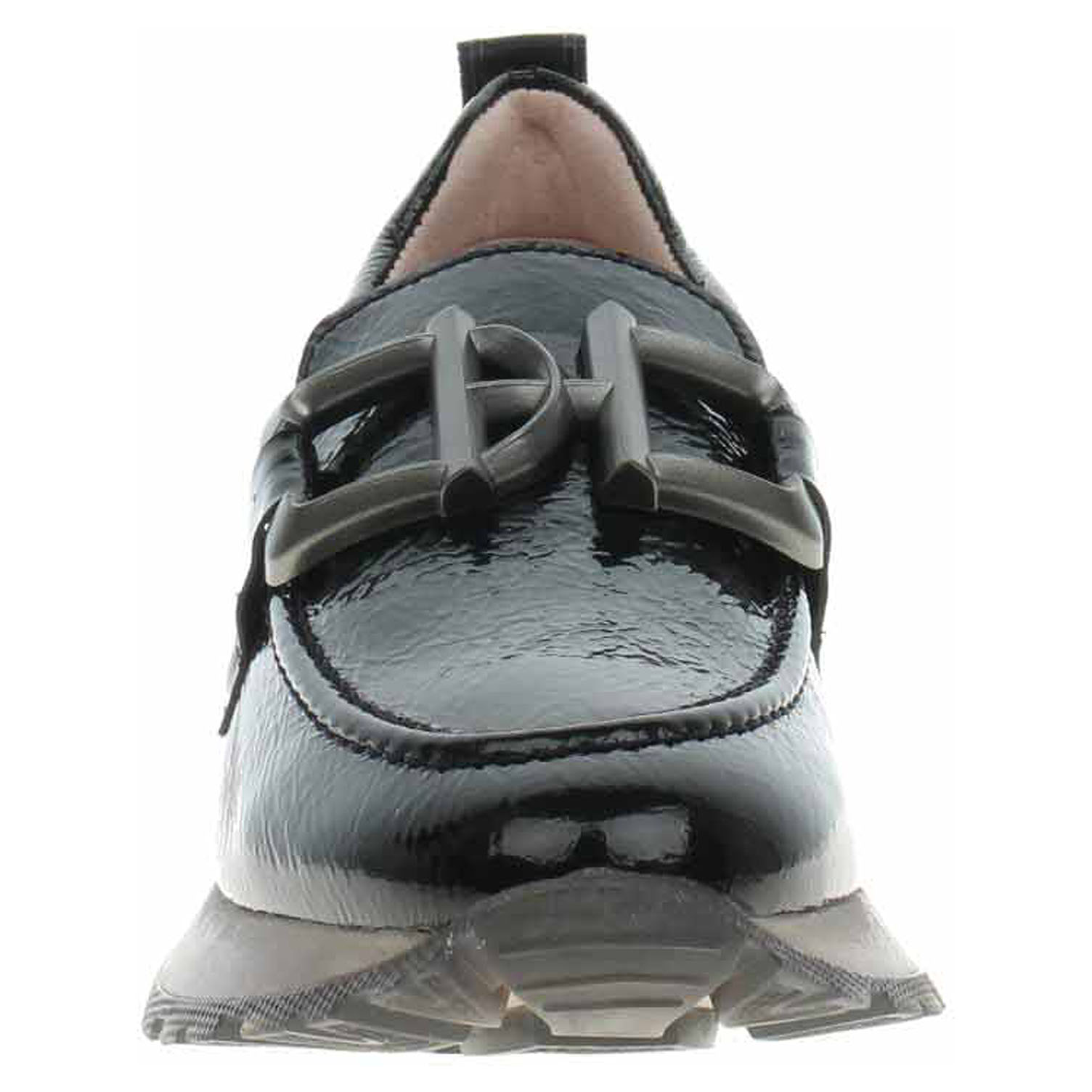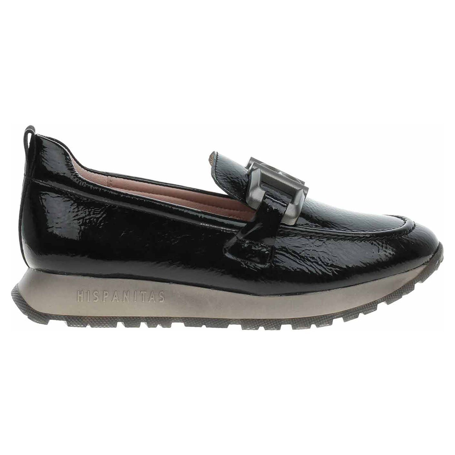 Boty Hispanitas - lakované dámské mokasiny s ozdobnou sponou na nártu mají svršek i podšívku z usně a jsou vybavené vyndavací stélkou s nášlapnou vrstvou z usně. Technologie Triflow: trojité polstrování v oblasti běhounu, které absorbuje nárazy a poskytuje tlumený efekt při chůzi. Podešev z termoplastického polyuretanu poskytuje vynikající odpružení a protiskluzovou přilnavost. Klínek je vysoký 3,- cm. používání. Lakovaná obuv - hladký, lesklý povrch je docílen lakovou úpravou. Povrch je choulostivý na mechanické poškození, rozmáčení a mráz. Ošetřujte prostředky na lakové usně.