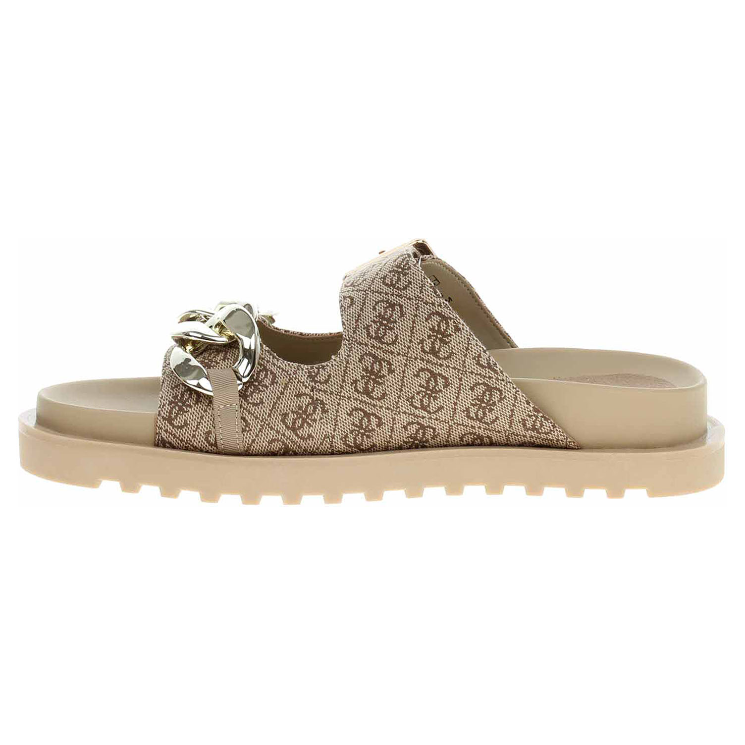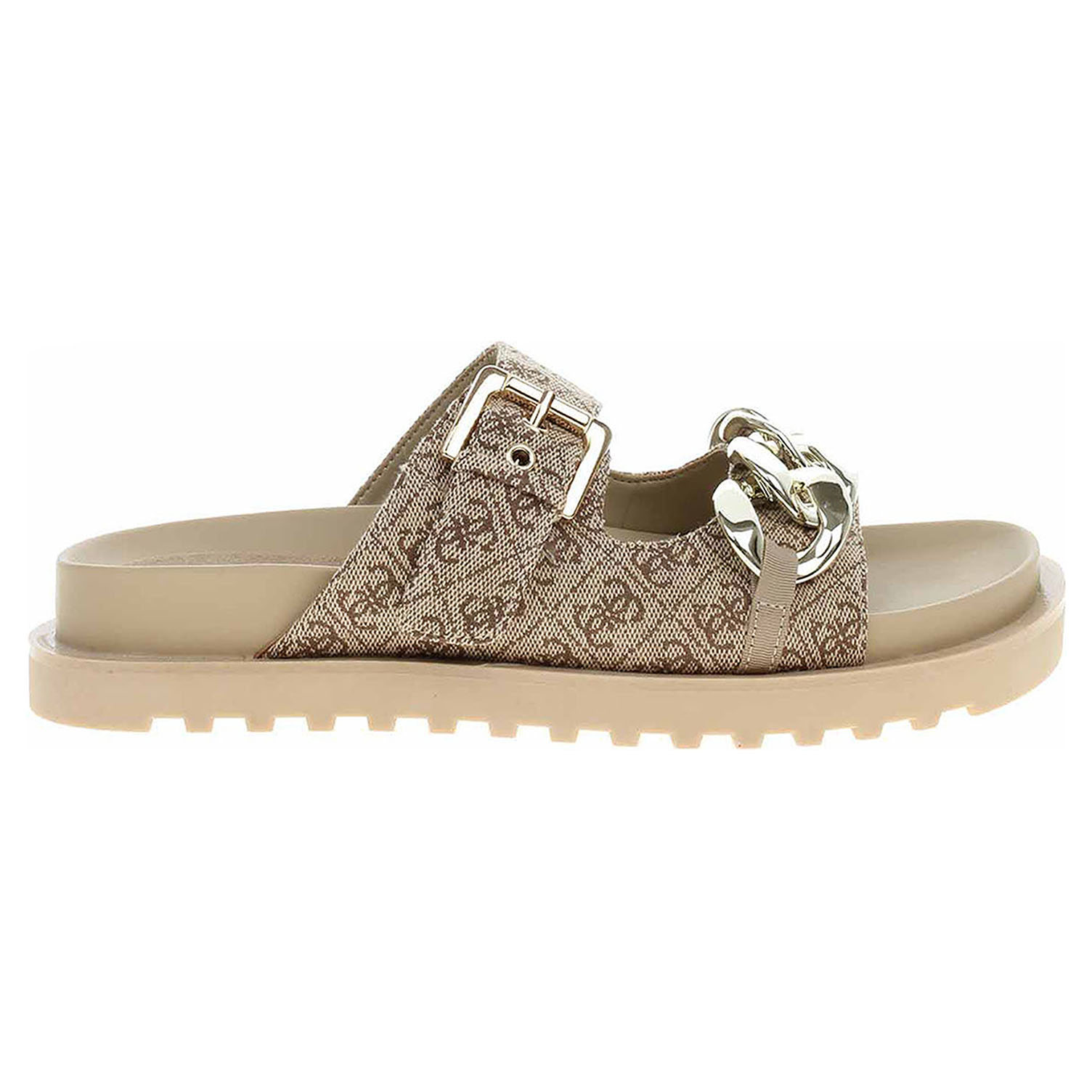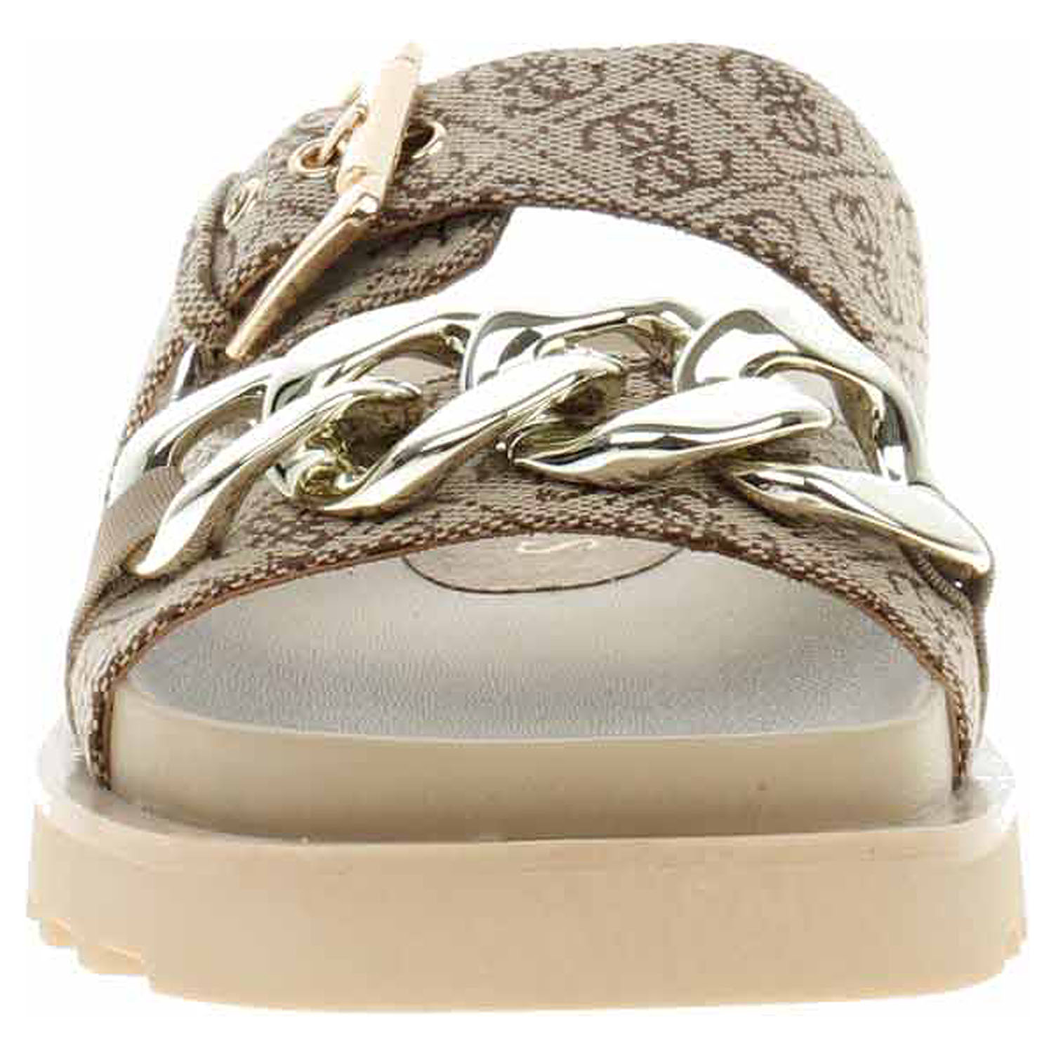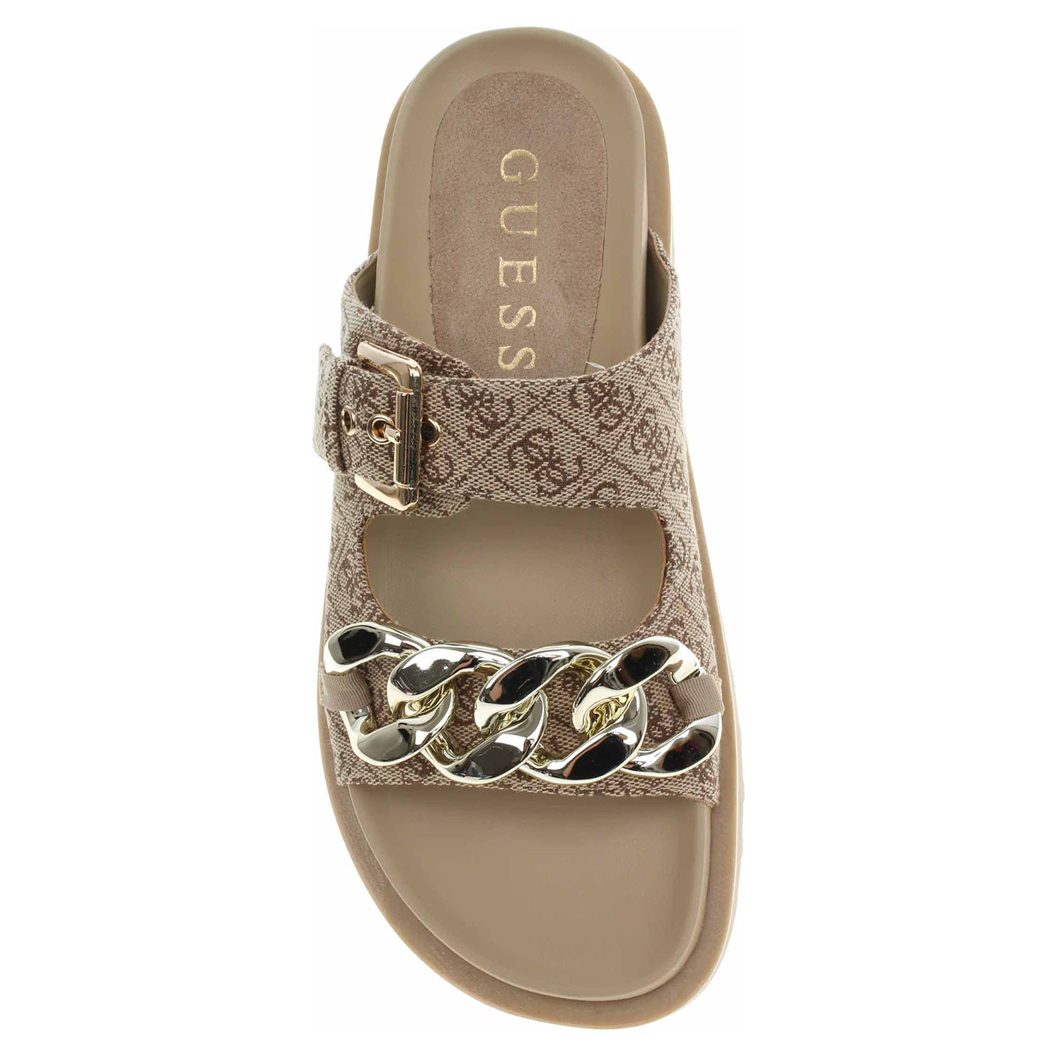 Guess - módní dámské pantofle s potiskem loga 4G mají textilní svršek (100% polyester), podšívku ze syntetiky a stélku kombinovanou syntetika/textil. Přední pásek přes špičku je ozdobený zlatým řetízkem a pásek přes nárt se zapíná na přezku. Klínek je vysoký 3,5 cm a platforma je vysoká 1,8 cm. Módní obuv - je určena pro krátkodobé nošení v nenáročných podmínkách. Prvořadá je módnost nikoliv životnost. Obuv není vhodná pro každodenní používání.