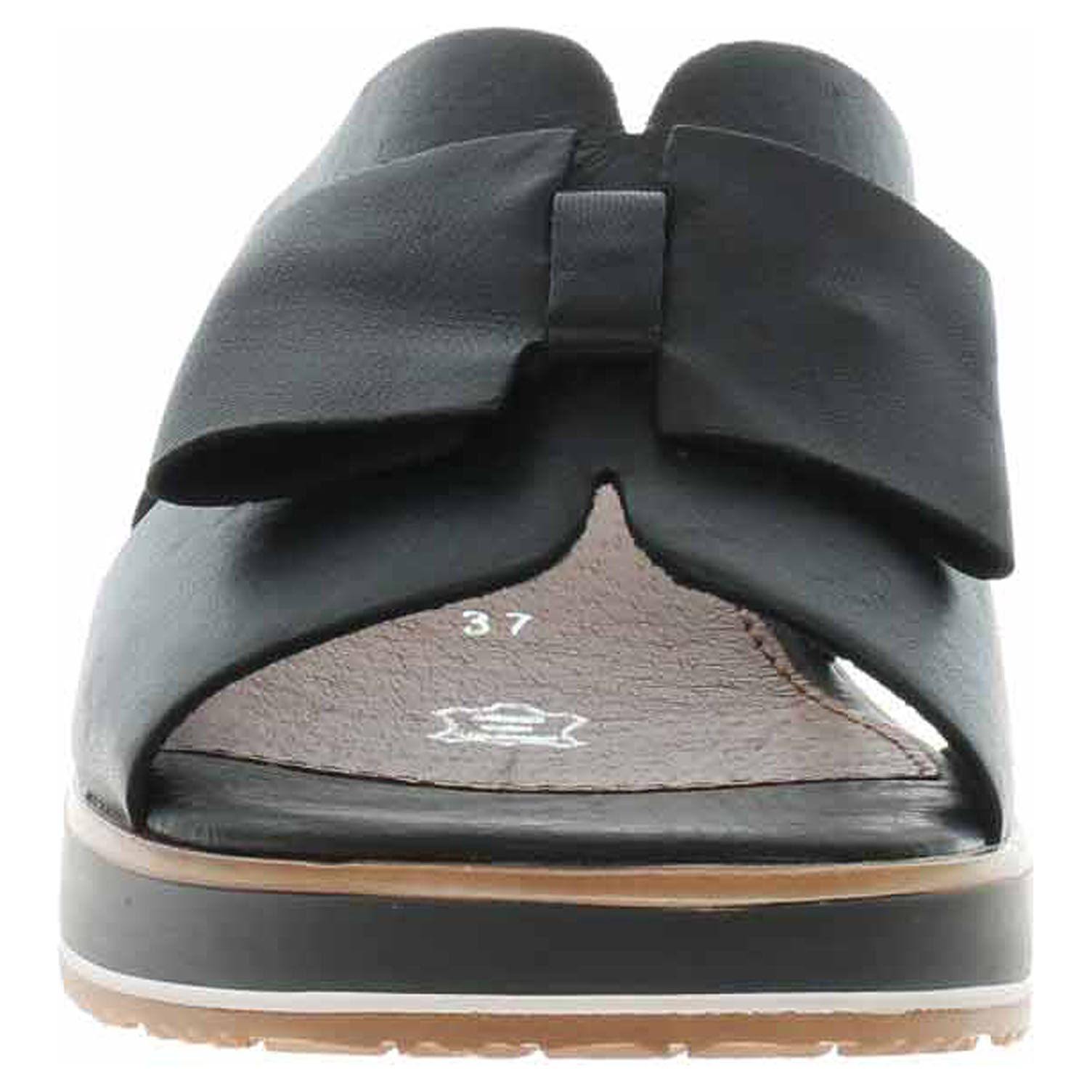 Boty Remonte - dámské vycházkové pantofle s mašličkou mají svršek z usně, textilní podšívku a jsou vybavené stélkou Remonte Soft (prodyšné stélky tlumící nárazy a odvádějící vlhkost) s nášlapnou vrstvou z usně. Pásek přes nárt je na vnitřní straně vybavený vsazenou gumičkou. Klínek je vysoký 5,- cm a platforma je vysoká 2,- cm.