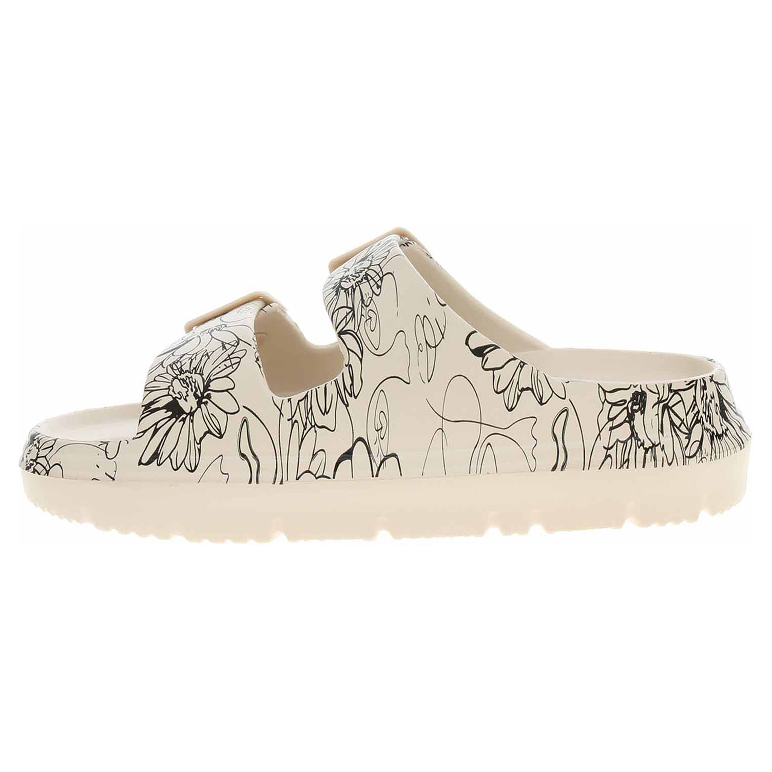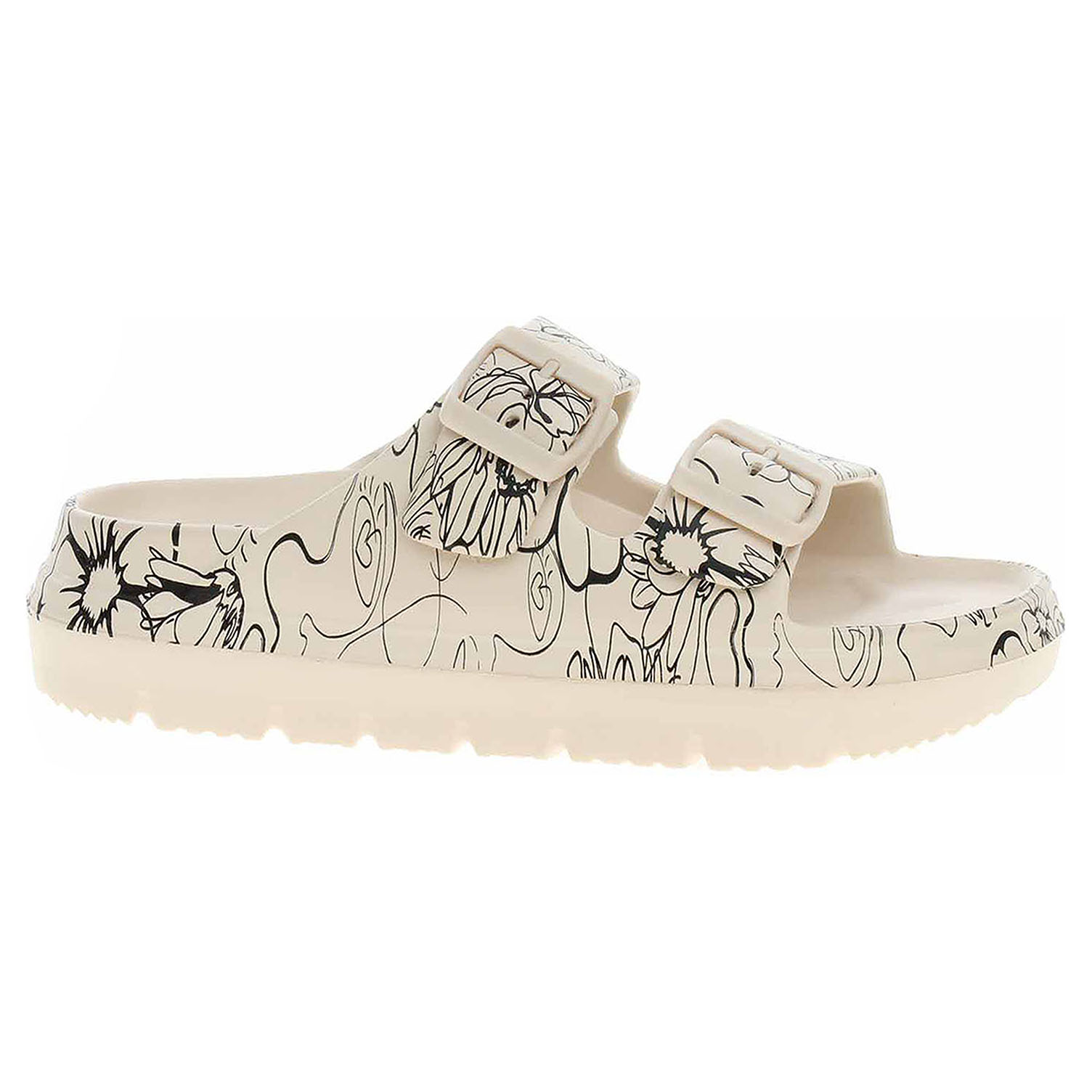 Laura Vita - plážové dámské pantofle ze 100% EVA materiálu (komfortní pěnový materiál zjemňující otlačeniny, zvyšující elasticitu a umožňující tak delší používání) mají klínek vysoký 3,- cm a platforma je vysoká 2,- cm. Pásky přes nárt s přezkami umožňiují variabilně měnit objem nártu. Plážová obuv - je určena k rekreačním účelům v okolí koupališť, jezer a mořských pláží. Obuv není vhodná při chůzi na tvrdém povrchu - chodník, silnice.