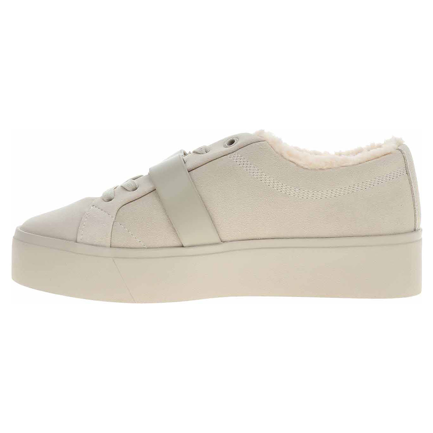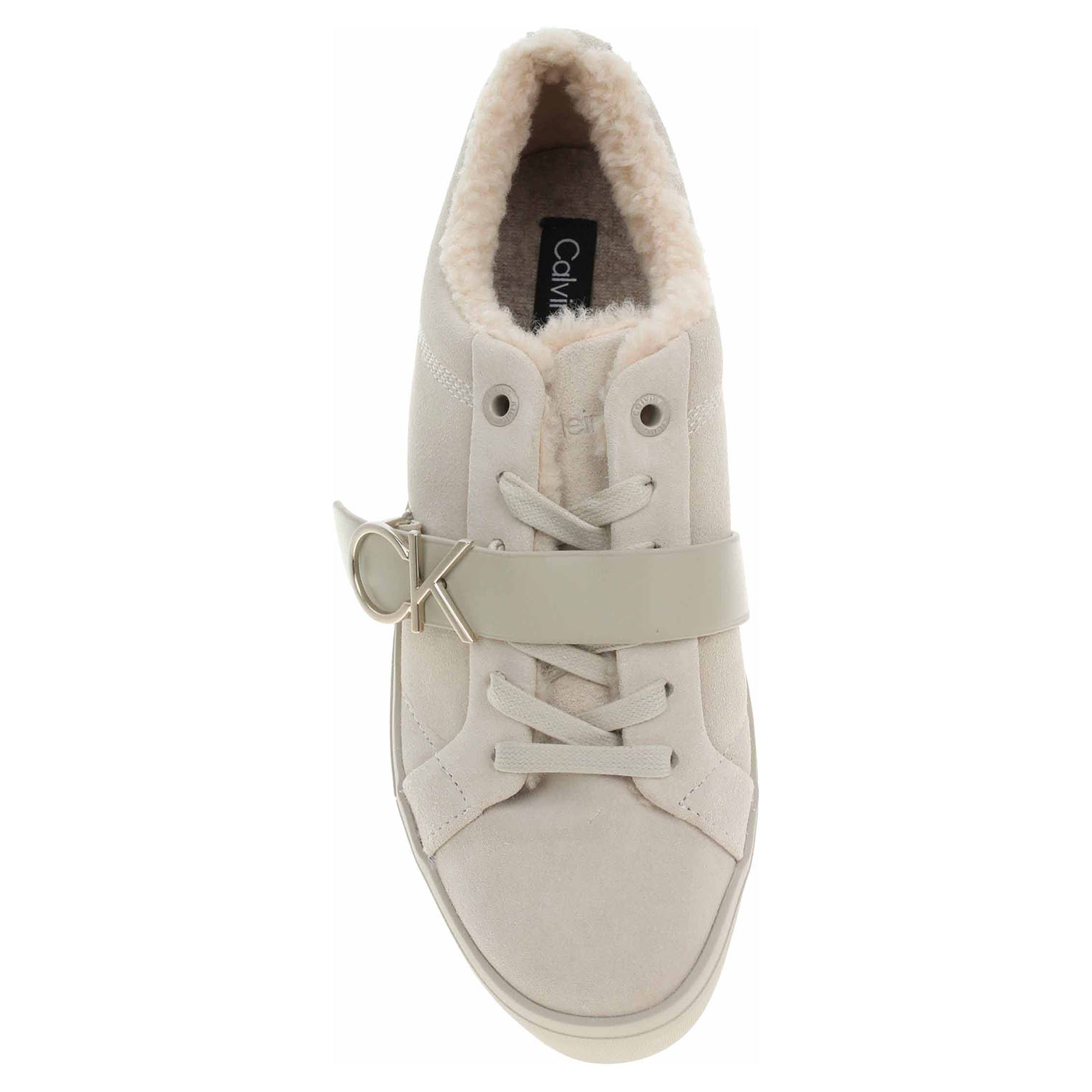 Calvin Klein - módní dámské polobotky se šněrováním a s ozdobným páskem přes nárt mají svršek z usně, textilní stélku a jsou vyteplené textilní podšívkou s jemným chloupkem (100% recyklovaný polyester). Klínek je vysoký 3,5 cm a platforma je vysoká 2,5 cm. Módní obuv - je určena pro krátkodobé nošení v nenáročných podmínkách. Prvořadá je módnost nikoliv životnost. Obuv není vhodná pro každodenní používání.