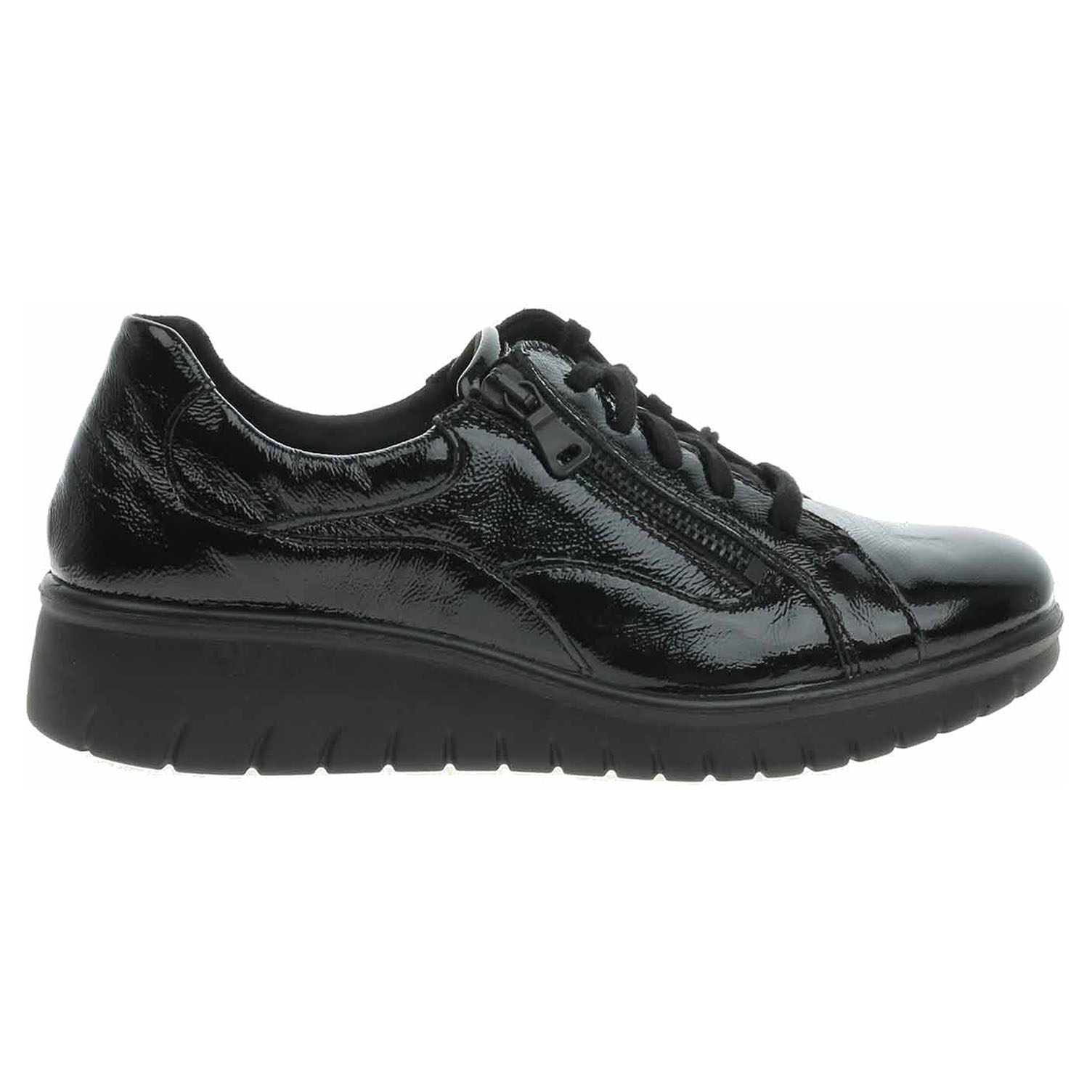 Boty Josef Seibel - lakované dámské polobotky se svrškem, podšívkou i stélkou z usně. Vyměnitelné vložky do bot je možné vyndat za účelem provětrání a omytí. Značnou výhodu nabízejí vyměnitelné vložky do bot také těm uživatelům, kteří používají ortopedické vkládací stélky. Pohodlné nazouvání zajišťuje šněrování a zip na vnější straně nártu. Klínek je vysoký 3,5 cm a platforma je vysoká 2,- cm. Lakovaná obuv - hladký, lesklý povrch je docílen lakovou úpravou. Povrch je choulostivý na mechanické poškození, rozmáčení a mráz. Ošetřujte prostředky na lakové usně.
