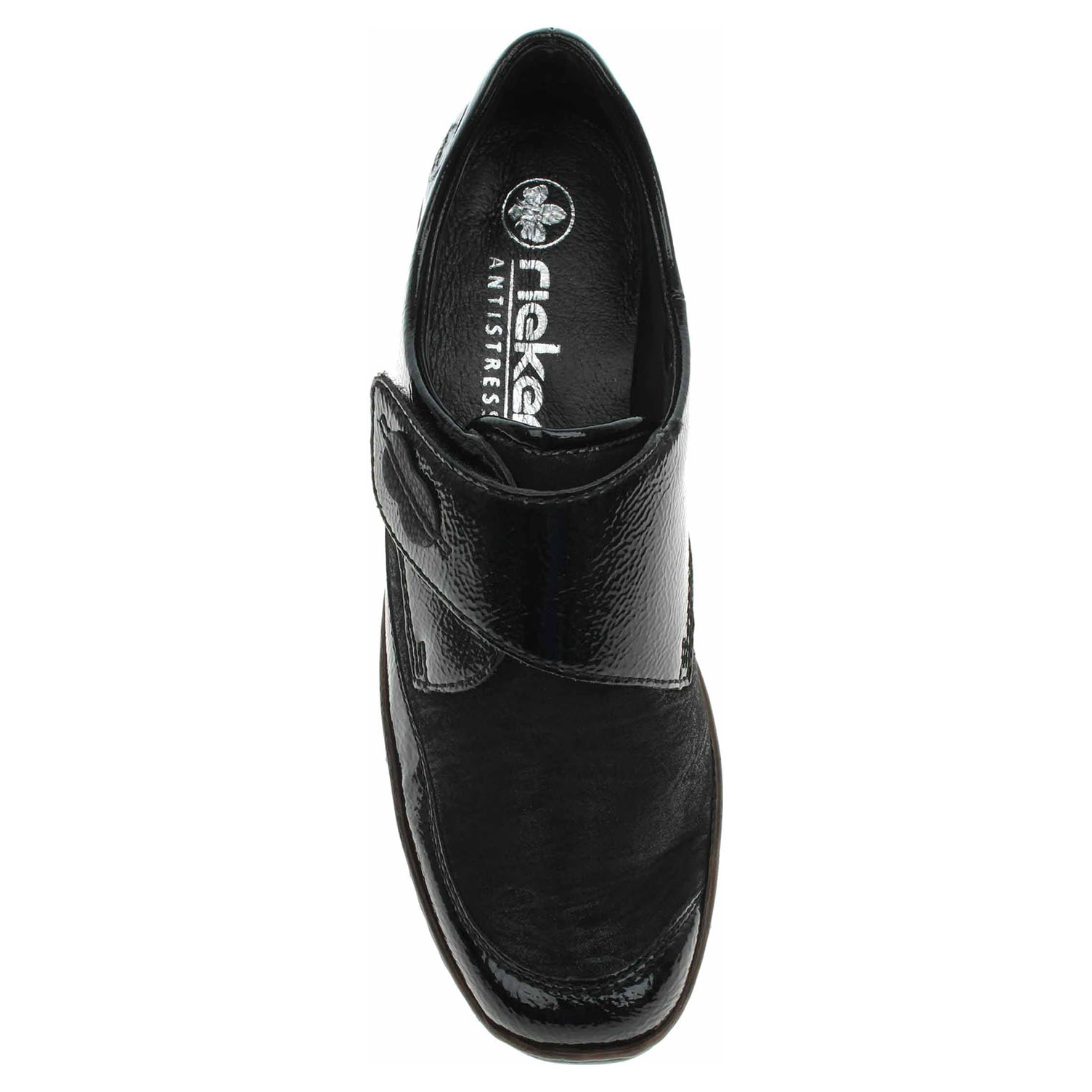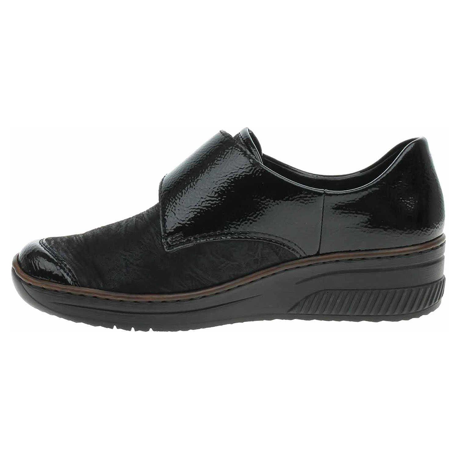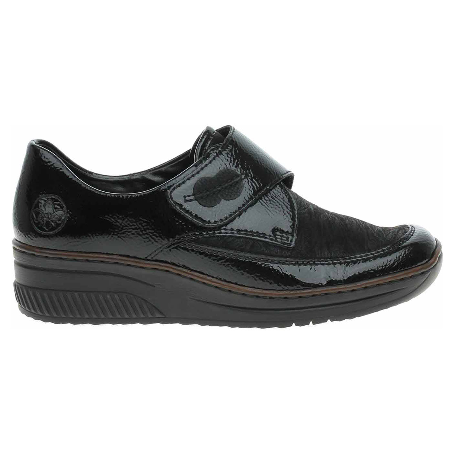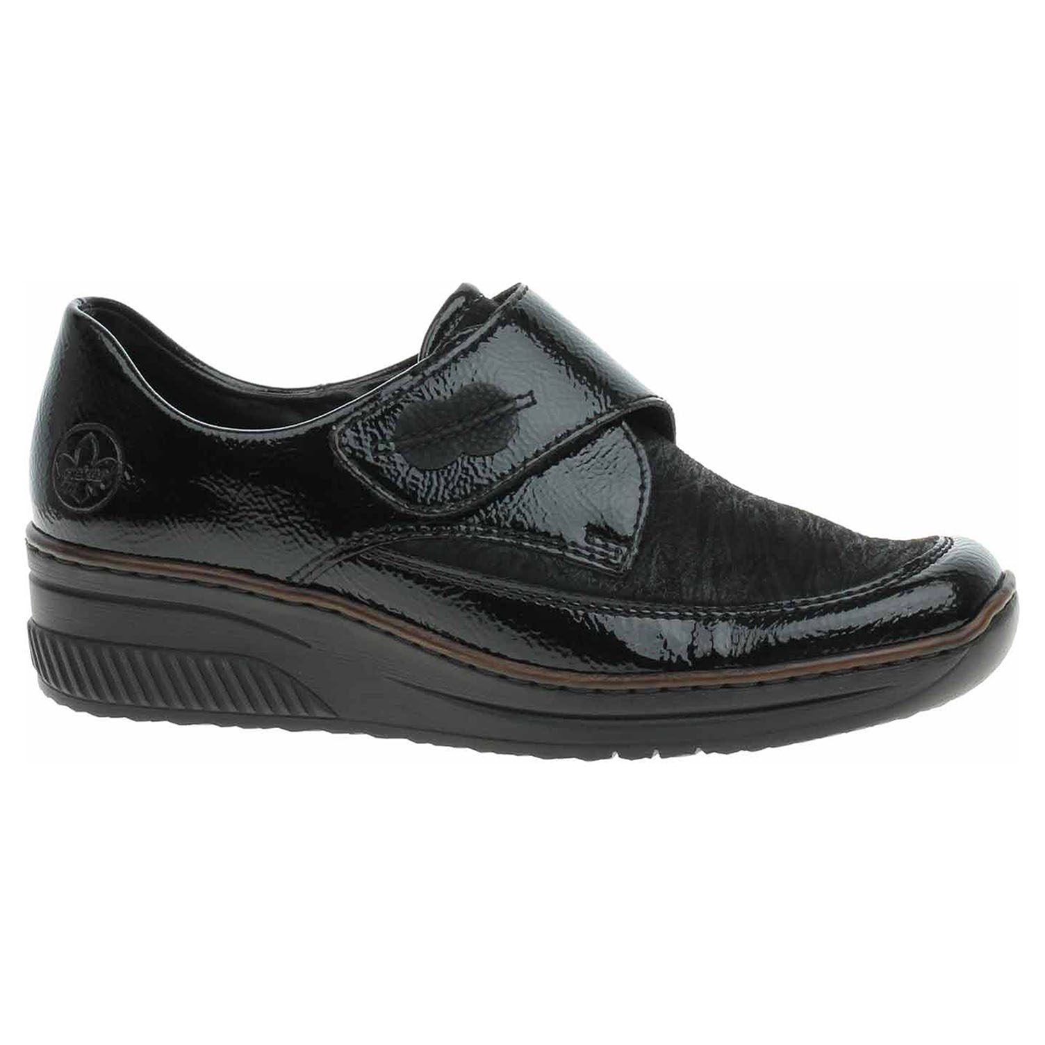 Boty Rieker - flexiblové dámské polobotky se svrškem kombinovaným useň/textil a s podšívkou ze syntetiky jsou vybavené vyměkčenou stélkou z usně. Pásek přes nárt se zapíná na suchý zip. Klínek je vysoký 4,3 cm a platforma je vysoká 1,5 cm. Podešev je flexibilní a díky systému Antistress skvěle tlumí nárazy a otřesy. Lakovaná obuv - hladký, lesklý povrch je docílen lakovou úpravou. Povrch je choulostivý na mechanické poškození, rozmáčení a mráz. Ošetřujte prostředky na lakové usně. Flexiblová obuv - prošívaná podešev, obuv používejte v suchém prostředí. Při zvýšené vlhkosti může dojít k promáčení obuvi. Obuv pravidelně impregnujte nebo krémujte, zvláště pak prošívaný okraj.