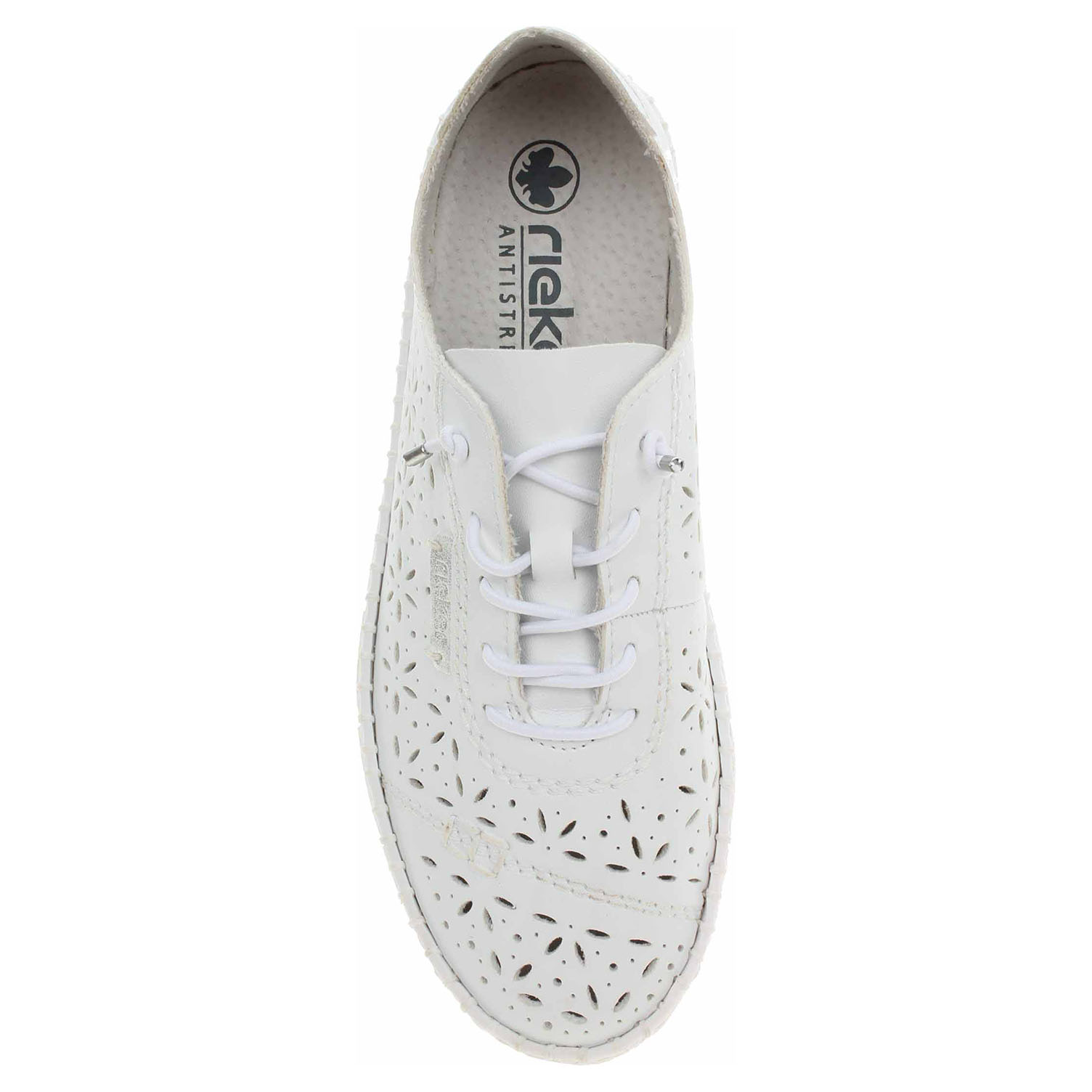 Boty Rieker - flexiblové dámské polobotky s perforovaným svrškem ze syntetiky, s textilní podšívkou a se stélkou z usně. Pohodlné nazouvání zajišťuje gumička provlečená šněrováním. Klínek je vysoký 2,7 cm. Podešev je flexibilní a díky systému Antistress skvěle tlumí nárazy a otřesy. Flexiblová obuv - prošívaná podešev, obuv používejte v suchém prostředí. Při zvýšené vlhkosti může dojít k promáčení obuvi. Obuv pravidelně impregnujte nebo krémujte, zvláště pak prošívaný okraj.