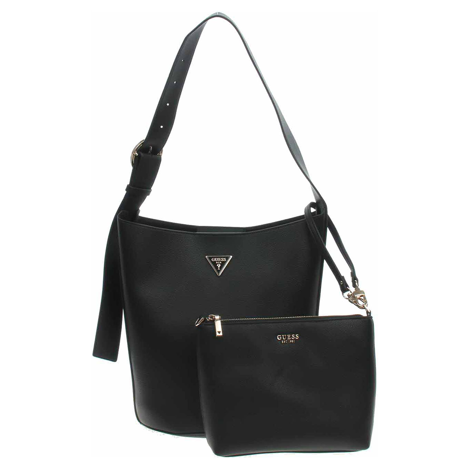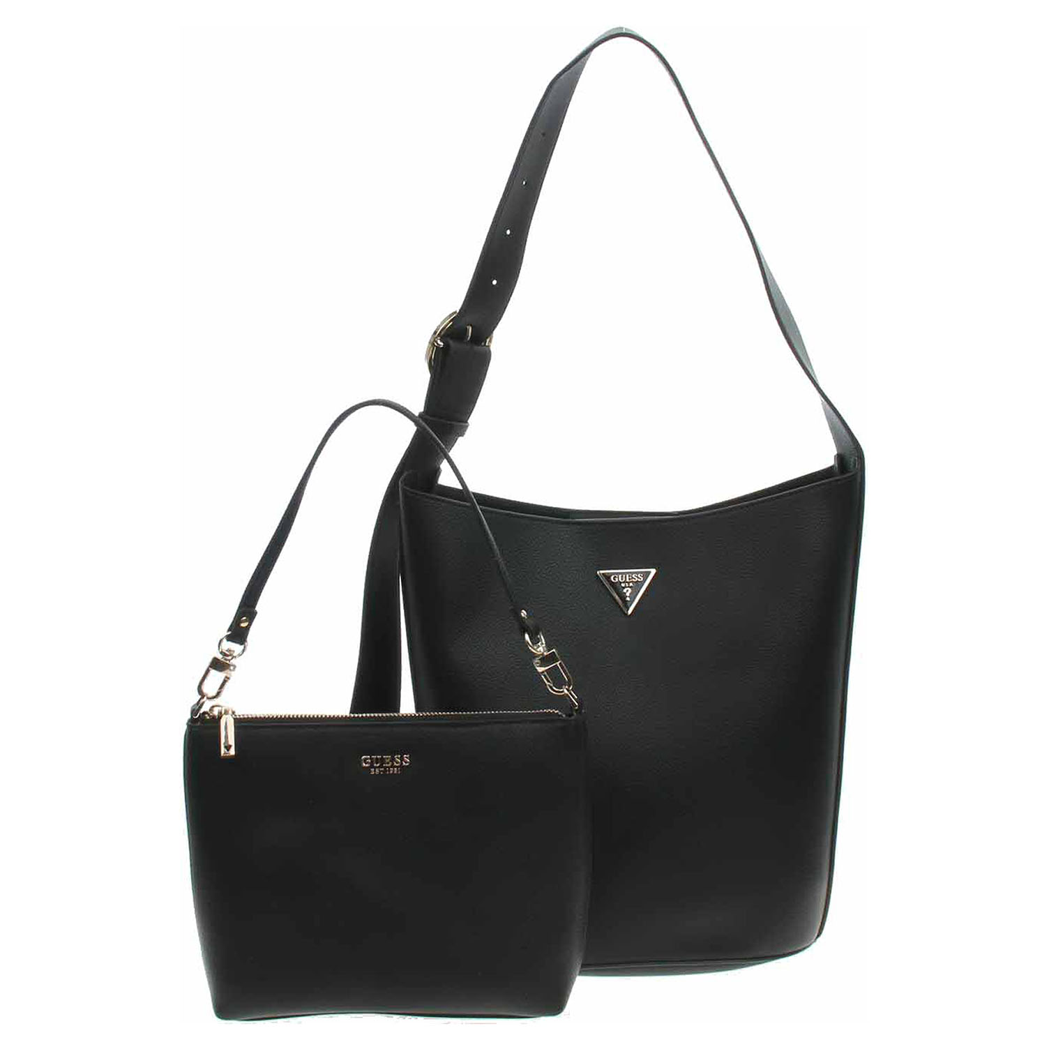 Guess Meridian II - dámská kabelka ze syntetického materiálu (100% polyuretan) se zapínáním na magnet má rozměry 26 x 30 x15 cm. Kabelku s trojúhelníkovým logem ve zlatém rámečku a se zlatým kováním je možno nosit v ruce nebo přes rameno na regulovatelném popruhu, který se nedá odepnout. Součástí kabelky je etue s popruhem a se zapínáním na zip (rozměry 24 x 18 x 6 cm), kterou je možno nosit jako malou kabelku. Vnitřní výbava kabelky: 1x kapsa bez zapínání. Údržba: Neprat. Skladujte v přiloženém prachovém sáčku. Pro správnou péči o tento doplněk dodržujte pokyny na štítku.