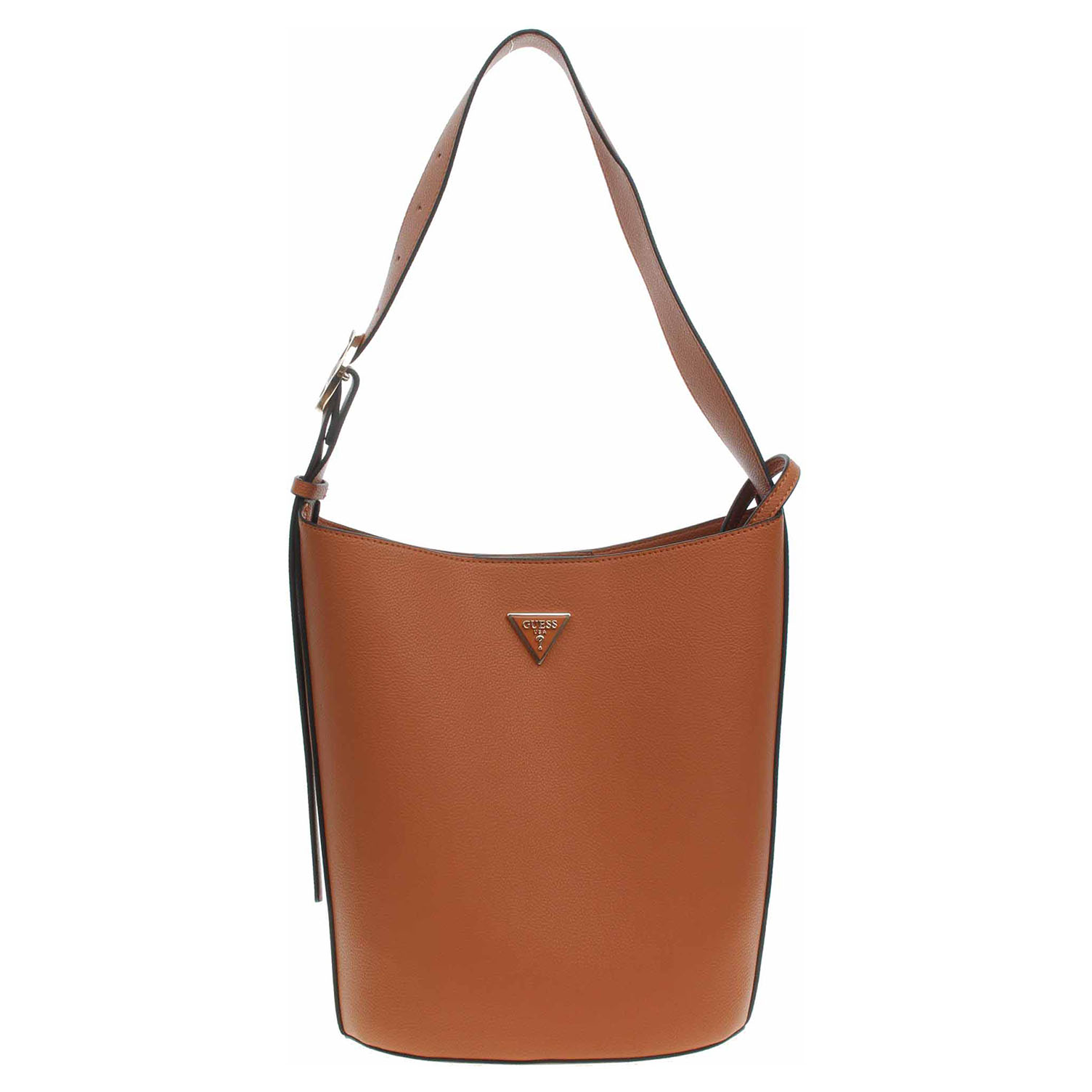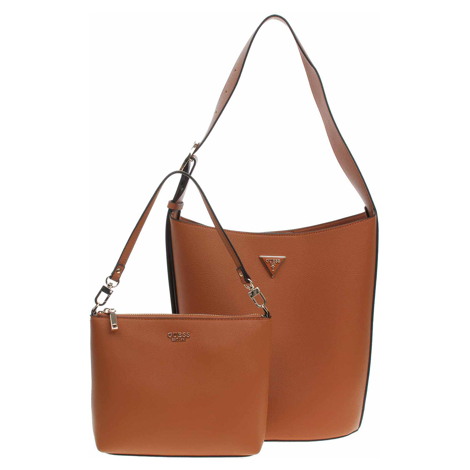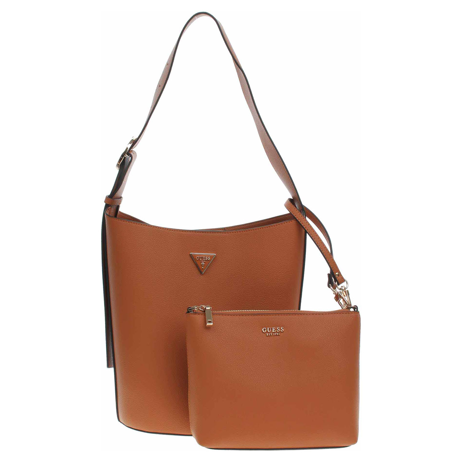 Guess Meridian II - dámská kabelka ze syntetického materiálu (100% polyuretan) se zapínáním na magnet má rozměry 26 x 30 x15 cm. Kabelku s trojúhelníkovým logem ve zlatém rámečku a se zlatým kováním je možno nosit v ruce nebo přes rameno na regulovatelném popruhu, který se nedá odepnout. Součástí kabelky je etue s popruhem a se zapínáním na zip (rozměry 24 x 18 x 6 cm), kterou je možno nosit jako malou kabelku. Vnitřní výbava kabelky: 1x kapsa bez zapínání. Údržba: Neprat. Skladujte v přiloženém prachovém sáčku. Pro správnou péči o tento doplněk dodržujte pokyny na štítku.