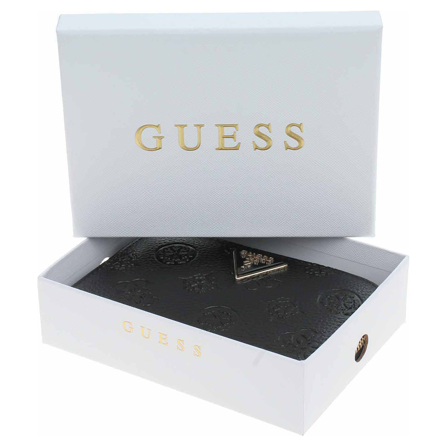 Guess - dámská peněženka ze 100% polyuretanu a s podšívkou ze 100% polyesteru se zapíná na zip. Peněženka je zdobená trojúhelníkovým logem ve zlatém rámečku a reliéfním logem 4G a pivoňkami. Vnitřní výbava: přihrádky na bankovky a na karty a kapsička na mince, která se zapíná na zip. Rozměry - 14 x 9 x 2,5 cm. Dárkové balení v originální krabičce.