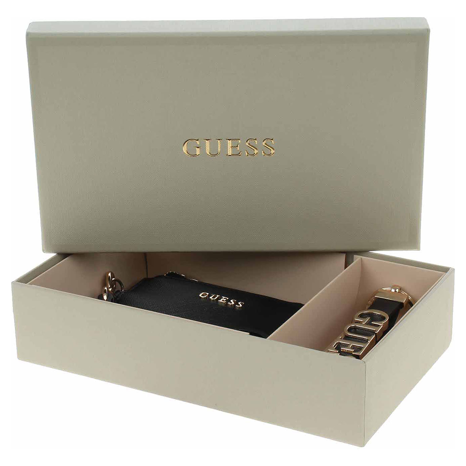 Guess Gift Pouch + Keyring - dámské pouzdro (peněženka) s klíčenkou v dárkové krabičce. Pouzdro (100% polyuteretan / 100% polyester) je vybavené odepínatelným poutkem s karabinkou a zapíná se na zip. Na zadní straně jsou dvě kapsičky bez zapínání.