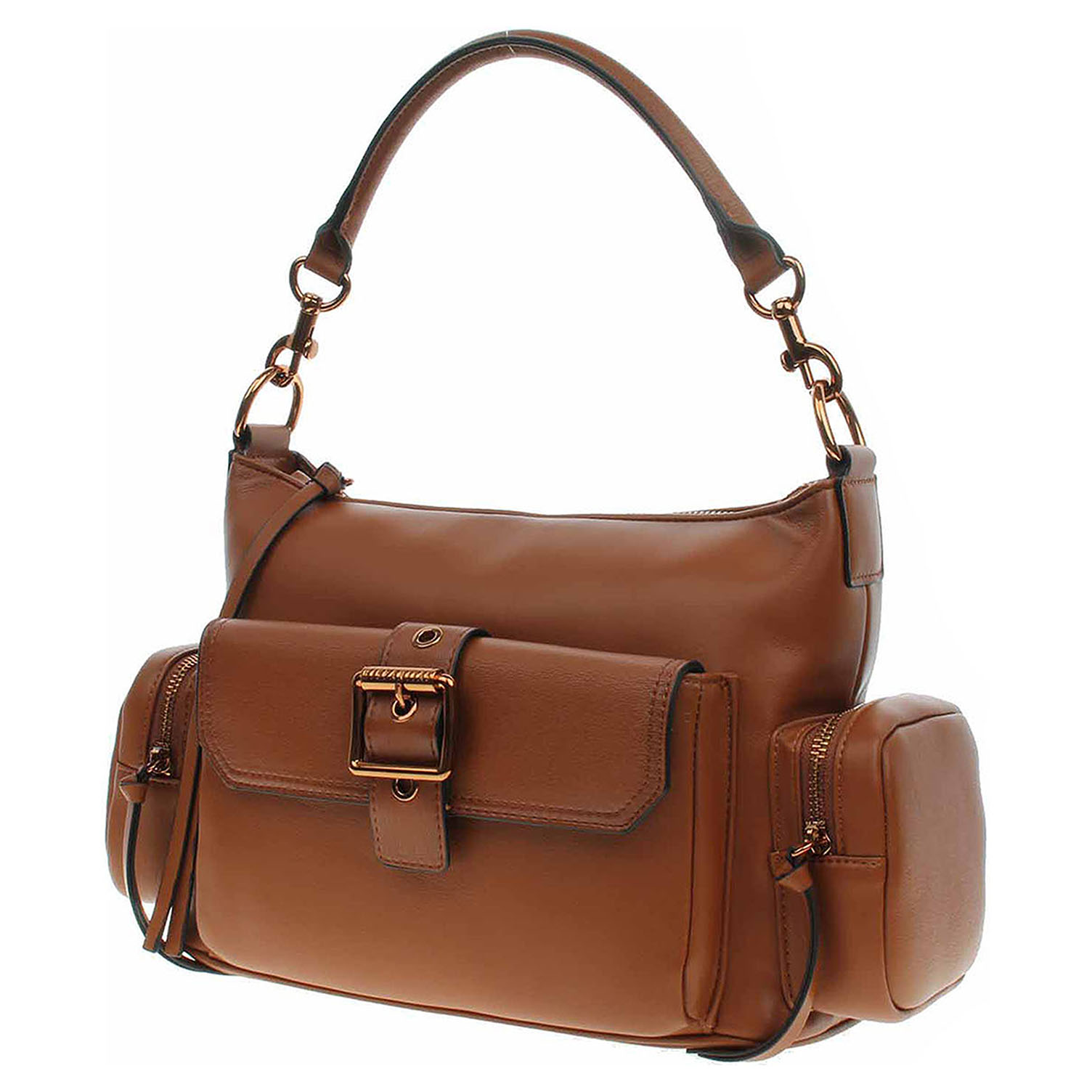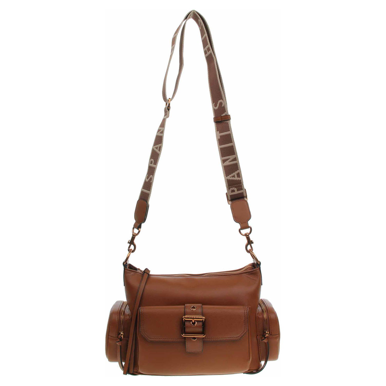 Hispanitas - dámská kabelka se zapínáním na zip je vyrobená z polyuretanu a podšívku má z polyesteru. Rozměry - 30 x 20 x 12 cm. Kabelku je možno nosit v ruce za odepínatelné ucho (výška cca 15 cm) s karabinkami nebo po výměně přes rameno a crossbody na regulovateleném popruhu (105–160 cm). Na přední straně je pohotovostní kapsa se zapínáním na magnet a na bocích jsou kapsičky se zapínáním na zip. Vnitřní výbava: 1 kapsa se zipem a 1x kapsička bez zapínání.