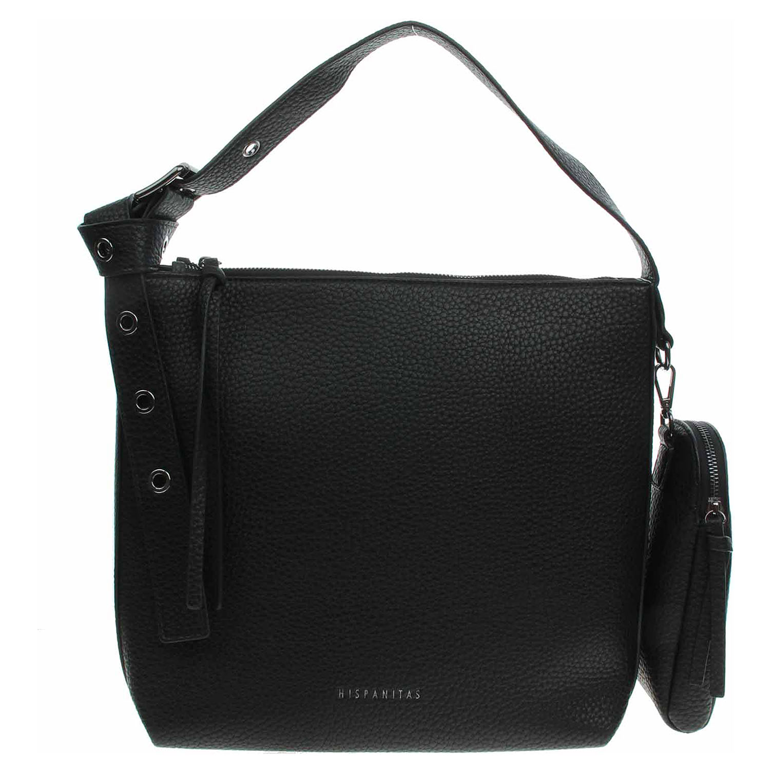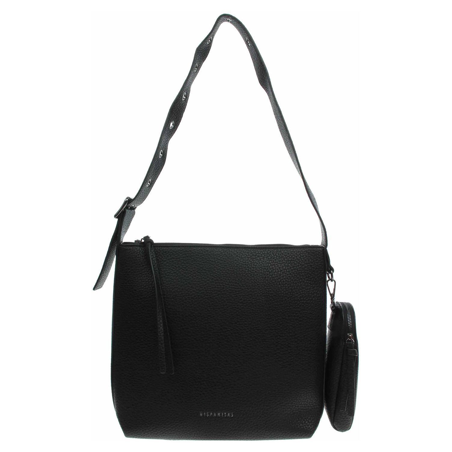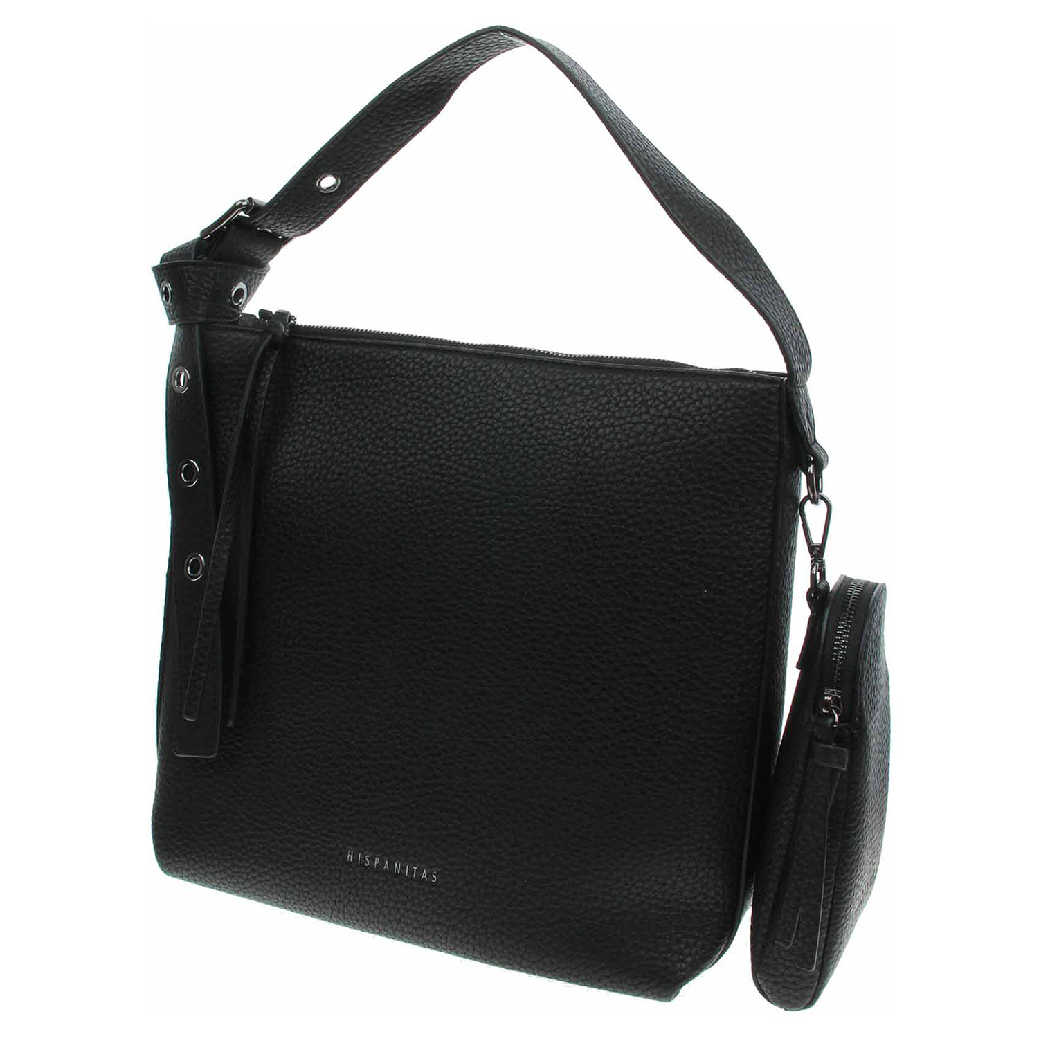 Hispanitas - dámská kabelka se zapínáním na zip je vyrobená z polyuretanu a podšívku má z polyesteru. Rozměry - 30 x 30 x 14 cm. Kabelku je možno nosit v ruce (výška cca 14 cm) nebo přes rameno na regulovateleném popruhu (max délka cca 90 cm). Součástí kabelky je kapsa s karabinkou, která se zapíná na zip a dá se odepnout. Vnitřní výbava: 1x kapsa se zipem a 1x kapsička bez zapínání.