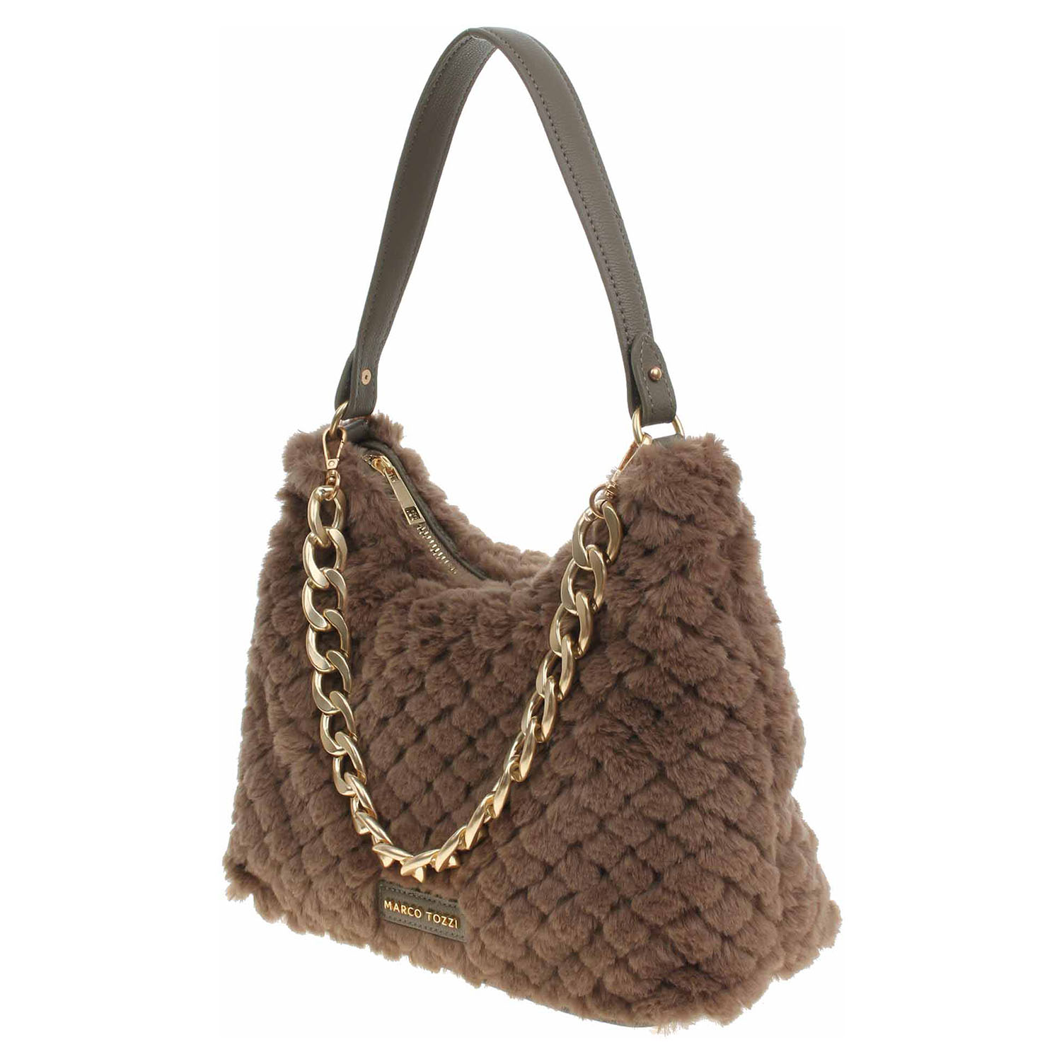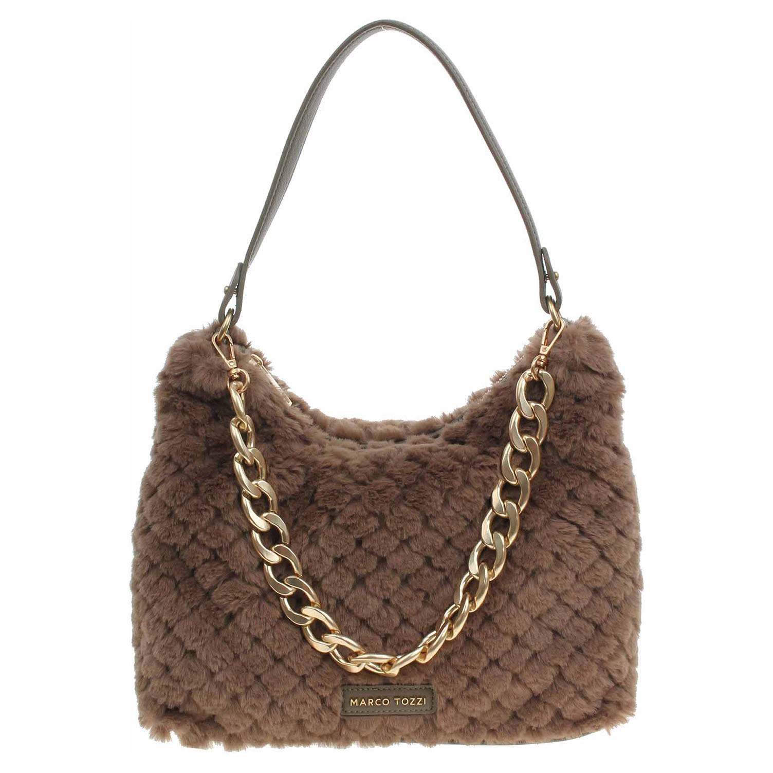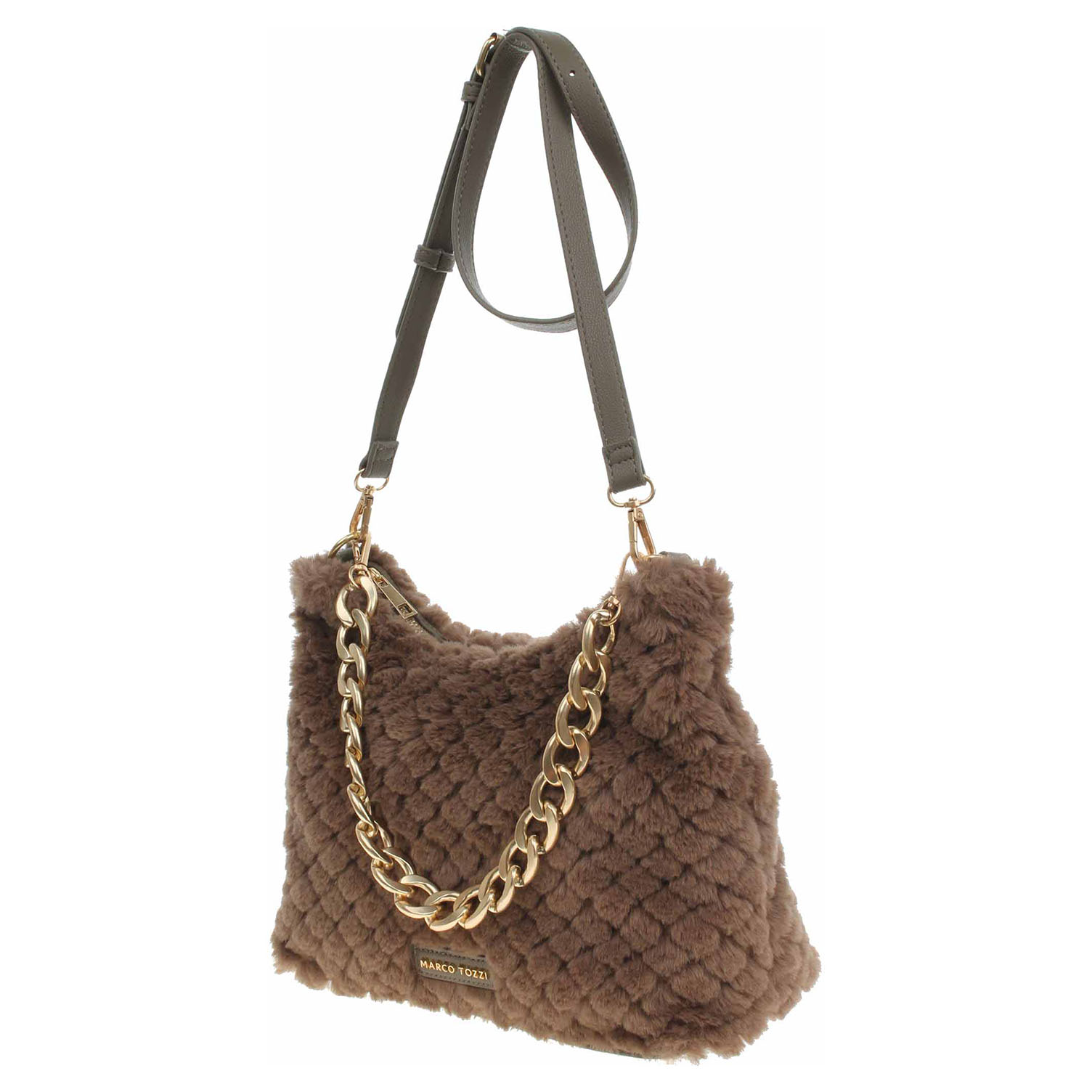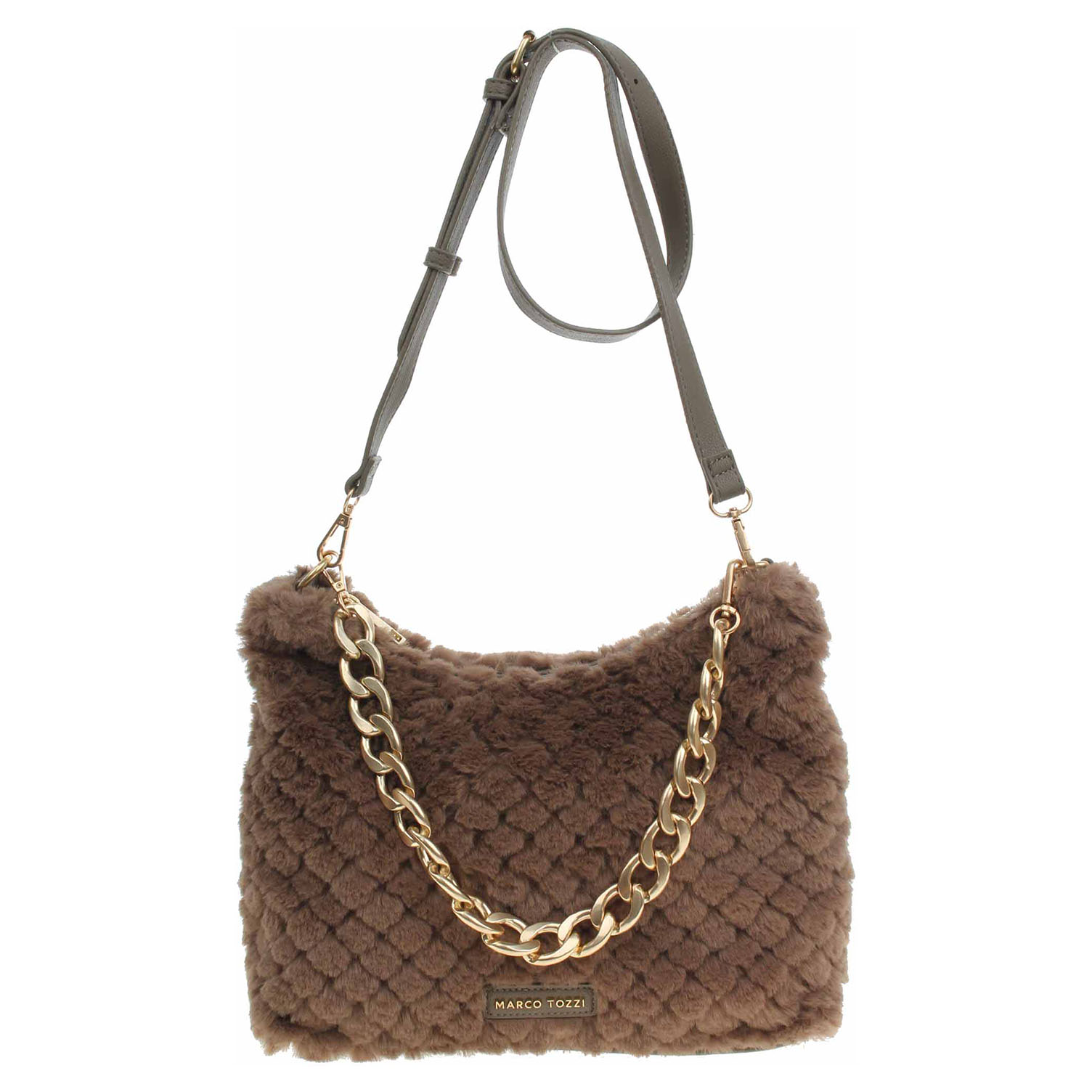 Marco Tozzi - dámská kabelka ozdobená řetízkem, který se dá odepnout, se zapíná na zip a má rozměry 20 x 29 x 11 cm. Kabelka je vyrobená v kombinaci polyester/polyuretan s podšívkou z polyesteru. Kabelku je možno nosit jen v ruce za odepínatelné ucho (výška 19 cm) nebo přes rameno na regulovatelném popruhu s karabinkami. Formát A4 se nevejde. Vnitřní výbava: 1x kapsa se zipem, 2x kapsička bez zapínání.