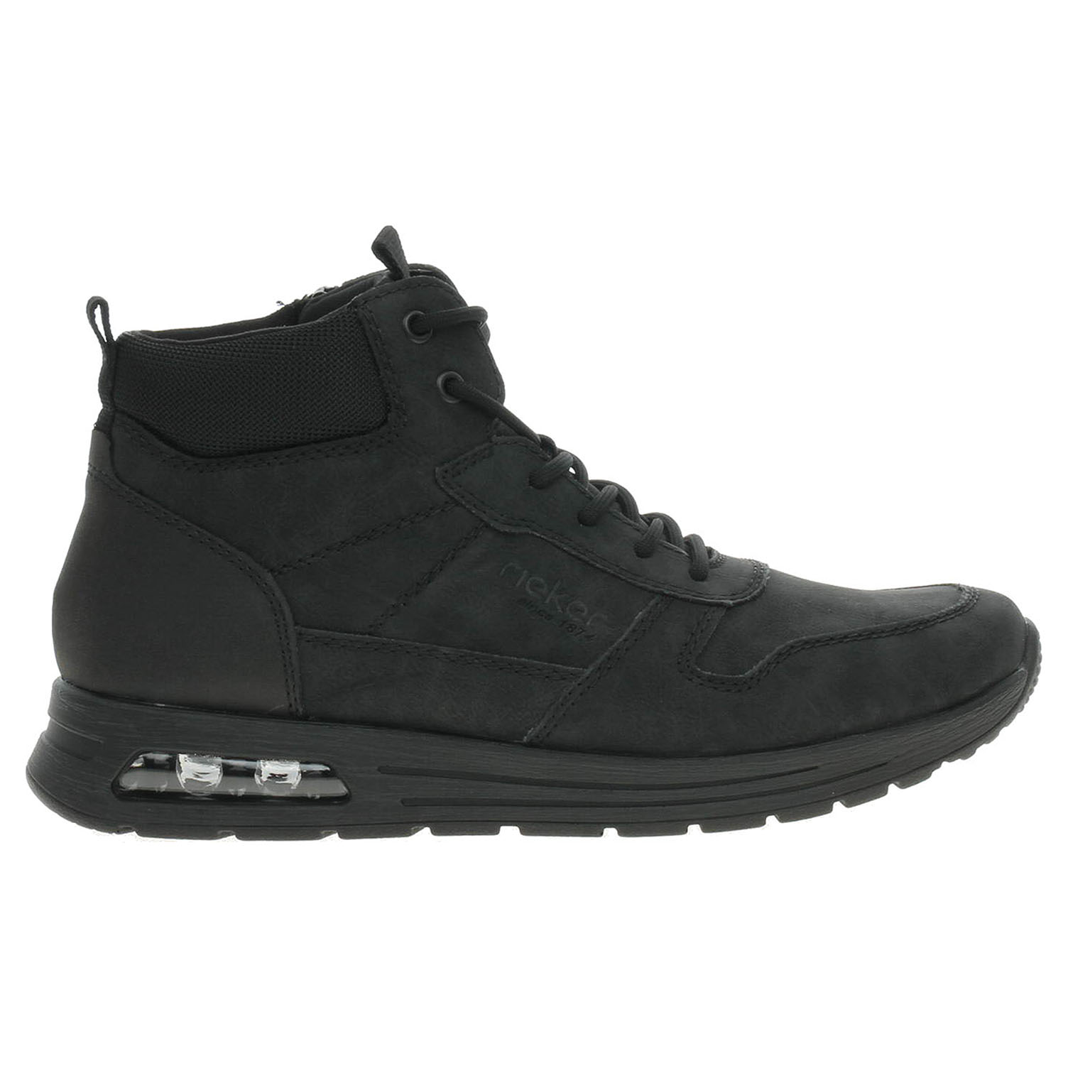 Boty Rieker - lepená pánská kotníková obuv se svrškem ze syntetiky a s textilním lemem u kotníku je vybavená vyndavací stélkou s textilní nášlapnou vrstvou. Vložky do bot je možné vyndat za účelem provětrání a omytí. Značnou výhodu nabízejí vyměnitelné vložky do bot také těm uživatelům, kteří používají ortopedické vkládací stélky. Pohodlné nazouvání zajišťuje šněrování a zip na vnitřní straně. Klínek se vzduchovým polštářem, který změkčuje došlap, je vysoký 3,5 cm. Podešev je flexibilní a díky systému Antistress (lehkost, pružnost, prostornost a vynikající absorpce nárazů) Vám obuv zajistí pohodlí při každém kroku. Lepená obuv - pevnost lepeného spoje může být negativně ovlivněna promáčením nebo propocením, event. opakovaným používáním nedostatečně vysušené obuvi. Při neopatrné chůzi může dojít k mechanickému uvolnění lepeného spoje - ukopnutí.