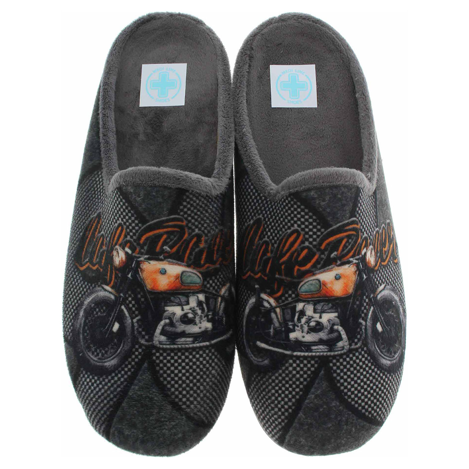 Boty Medi Line - pánské domácí pantofle se svrškem z extrémně jemného mikroplyše jsou vybavené vyndavací vyměkčenou stélkou s textilní nášlapnou vrstvou. Vyměnitelné vložky do bot je možné vyndat za účelem provětrání a omytí. Protiskluzová podrážka má klínek vysoký 3,- cm a platformu 1,- cm.