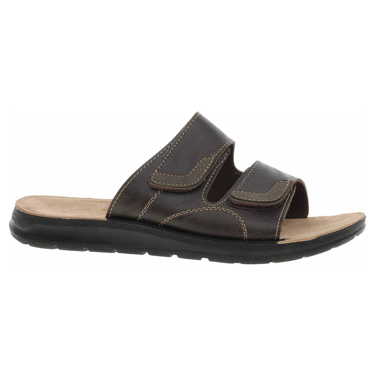 Boty Orto Med - pánské domácí pantofle s pásky přes nárt mají svršek i podšívku ze syntetiky a jsou vybavené vyměkčenou stélkou z usně. Pásky přes nárt je možno regulovat pomocí suchých zipů. Klínek je vysoký 2,5 cm.