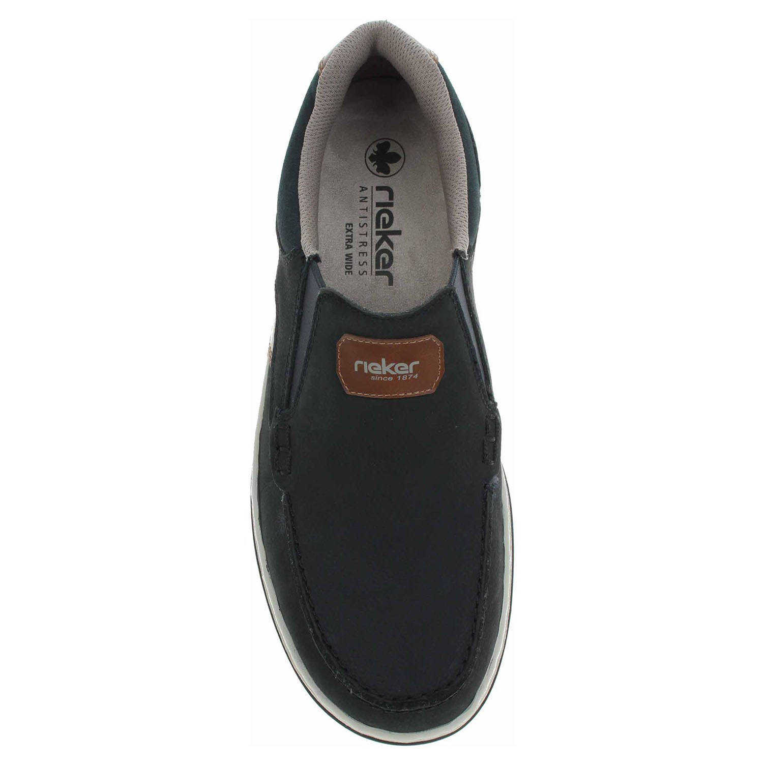 Boty Rieker - flexiblové pánské mokasiny nadměrné šíře mají svršek z usně, textilní podšívku a jsou vybavené vyndavací stélkou s textilní nášlapnou vrstvou. Pohodlné nazouvání zajišťují vsazené gumičky na nártu. Podešev je flexibilní a díky systému Antistress skvěle tlumí nárazy a otřesy. Flexiblová obuv - prošívaná podešev, obuv používejte v suchém prostředí. Při zvýšené vlhkosti může dojít k promáčení obuvi. Obuv pravidelně impregnujte nebo krémujte, zvláště pak prošívaný okraj.