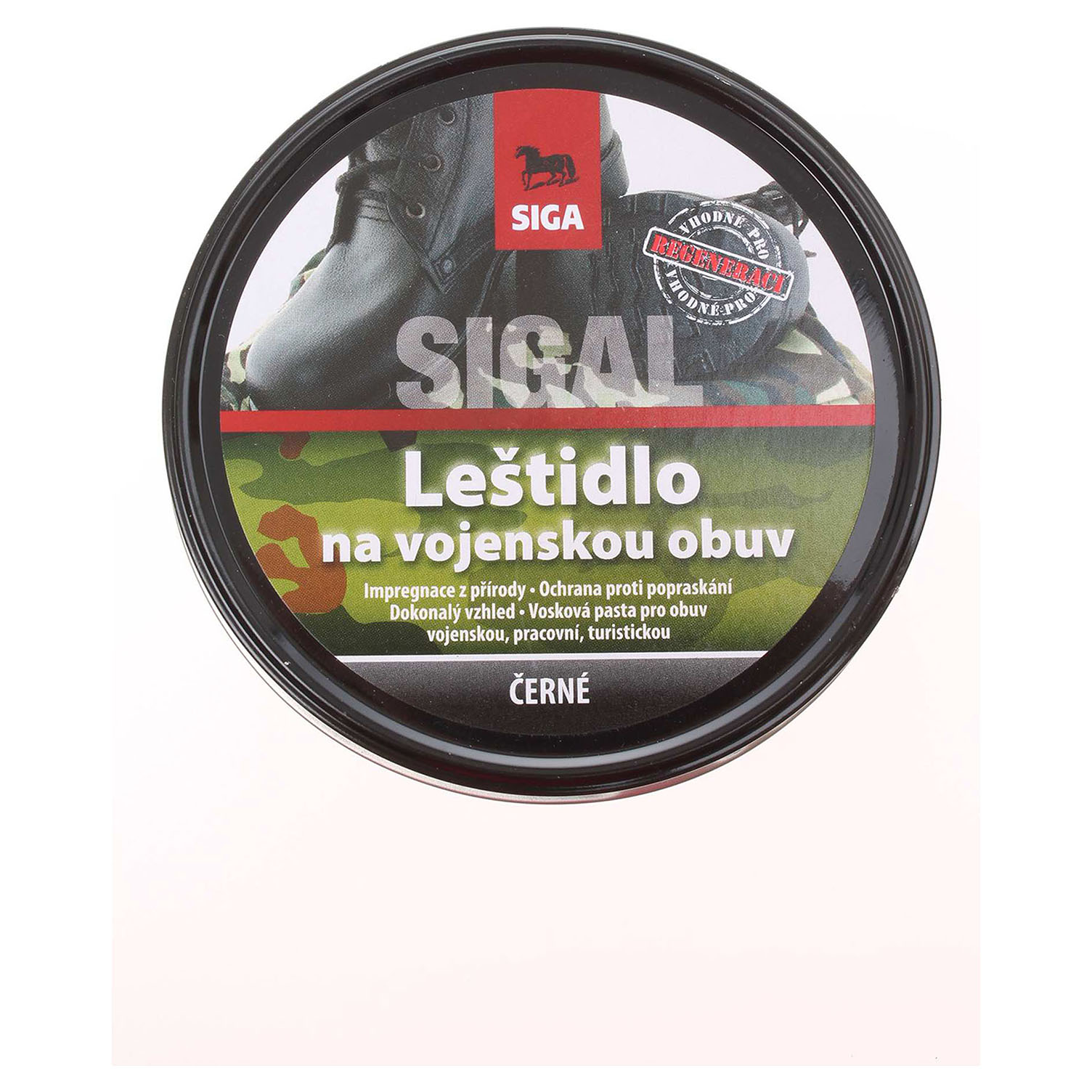 Sigal vojenské leštidlo - černé - 250 g - vysoce kvalitní směs přírodních a syntetických vosků, přírodních olejů a barviv. Tato kombinace předurčuje krém pro obuv vysoce namáhanou a používanou v extrémních podmínkách. Leštidlo zaručuje vysokou vodoodpudivost, má vynikající schopnost vykrývat